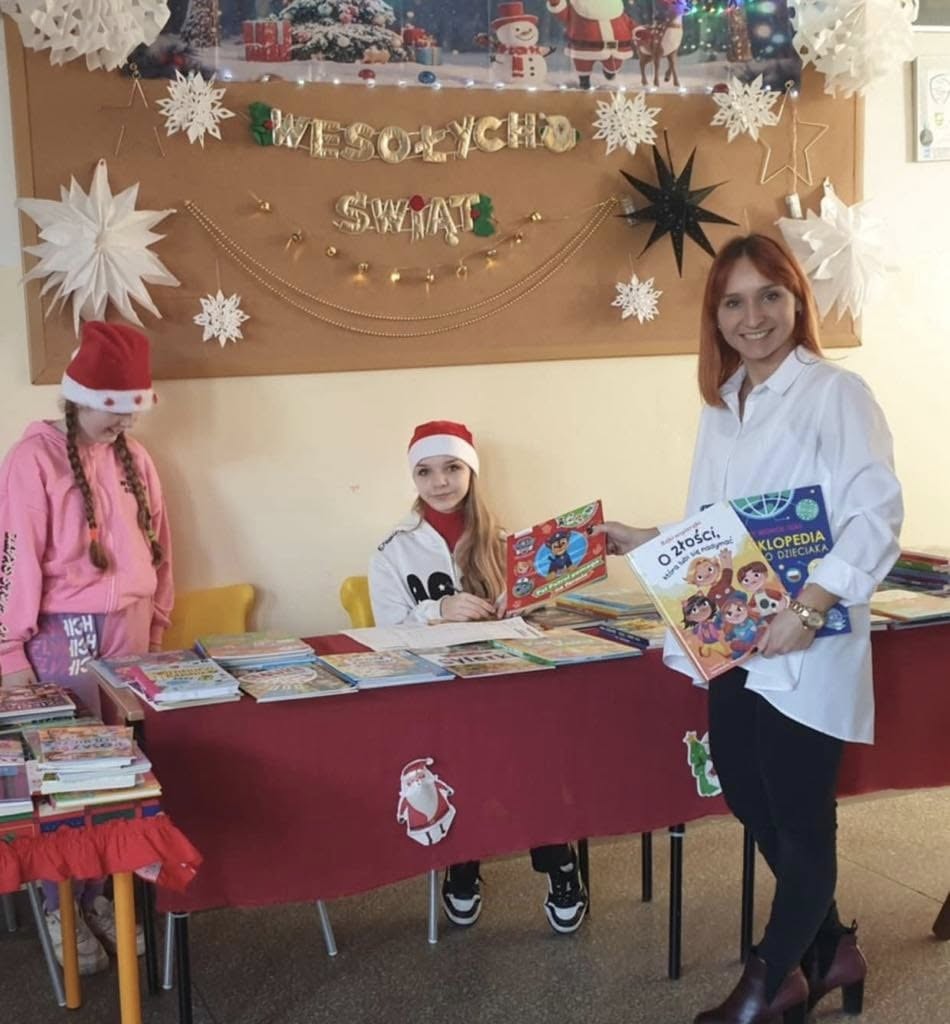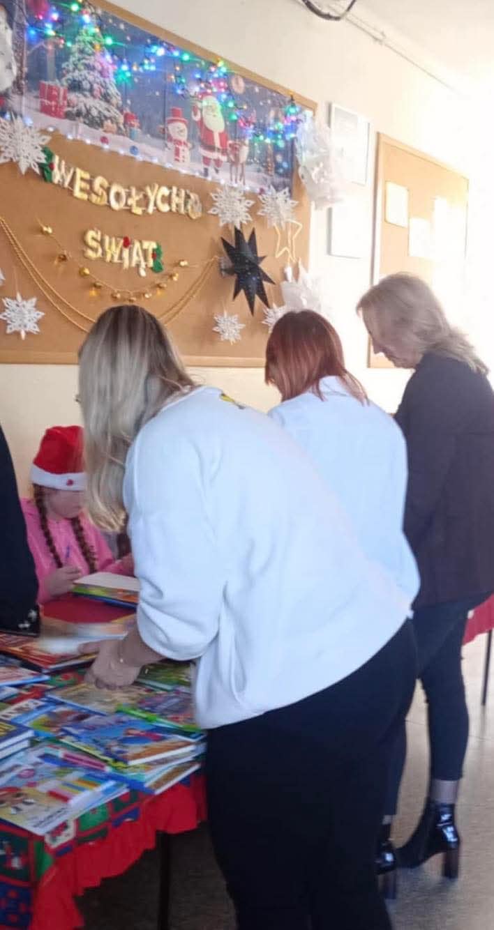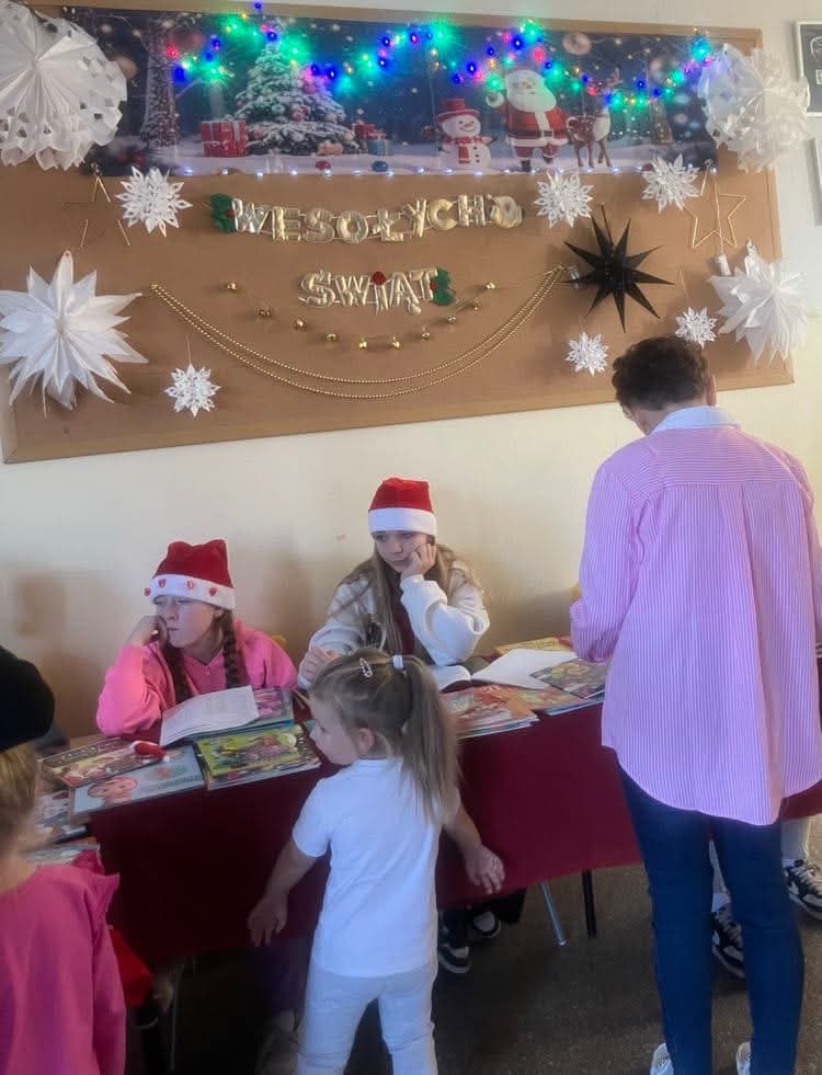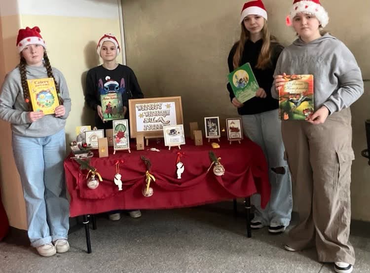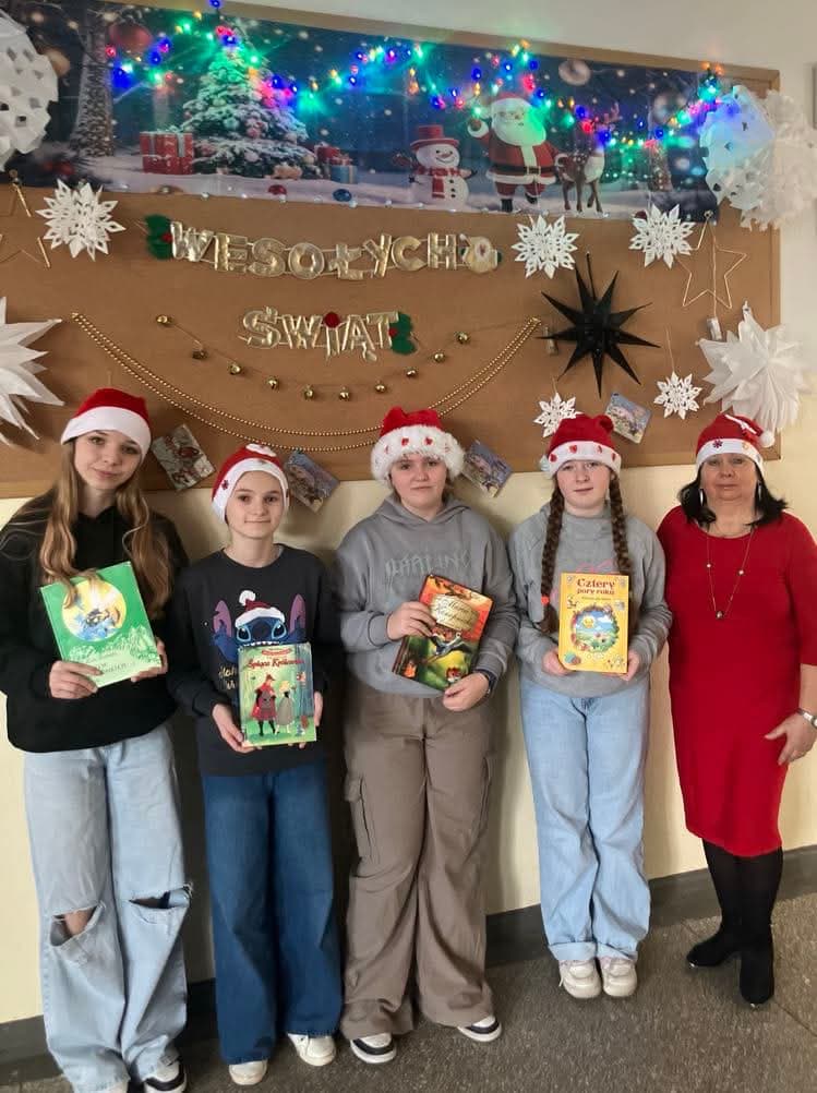 Dzięki wolontariuszkom: Natalii z klasy VII oraz Zuzi, Mai i Julki z klasy VI ze sprzedaży książek uzyskaliśmy rabat i zakupimy prezent dla Jacusia. W związku z tym, że Święta tuż ,tuż - dziewczyny zadbały o odpowiedni przedświąteczny nastrój. Zredagowały życzenia świąteczne, a następnie wpisały do wcześniej wykonanych kartek, prezentując je na szkolnym korytarzu. Hasło wystawy to ,,WSZYSCY WSZYSTKIM ŚLĄ ŻYCZENIA ".