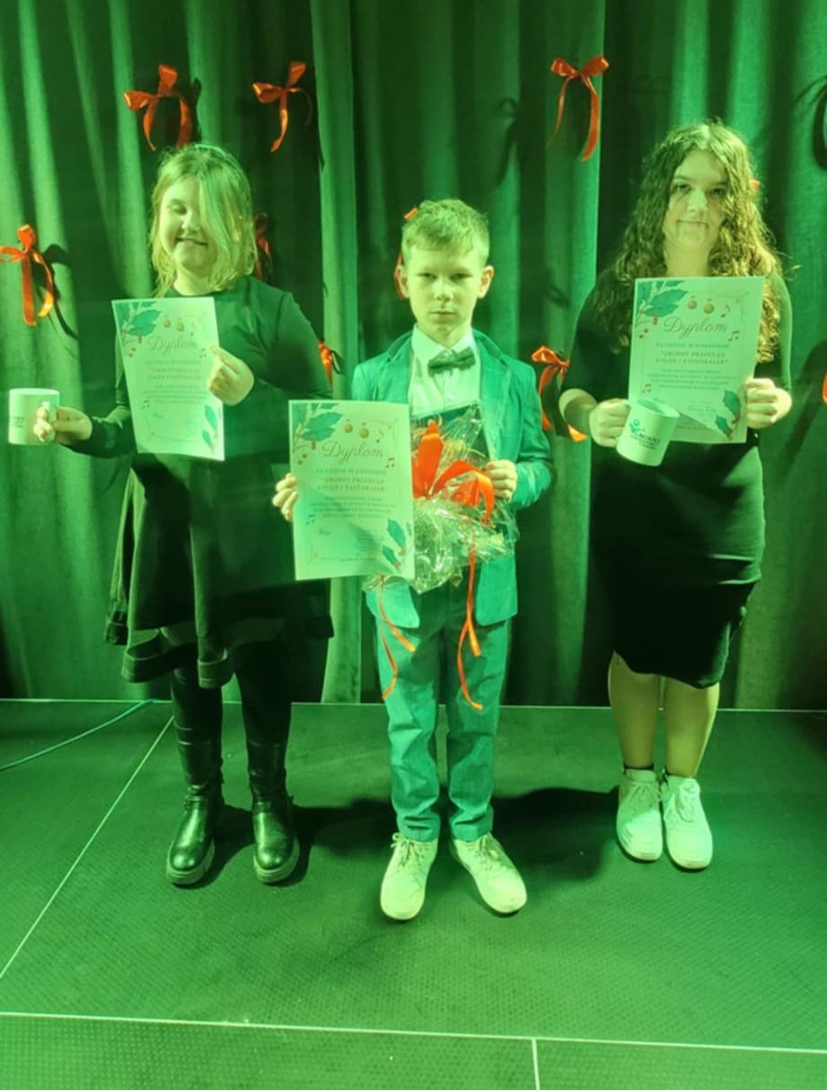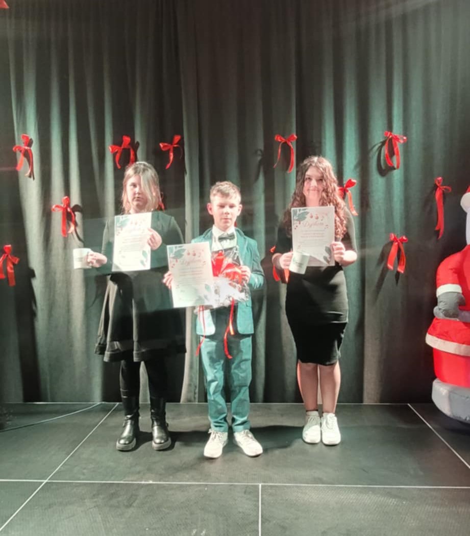 W piątkowe popołudnie Gminny Dom Kultury w Kościelcu zaczarował wszystkich obecnych nastrojem bożonarodzeniowym. 20.12.2024 r. odbył się tam Gminny Konkurs Kolęd i Pastorałek pod honorowym patronatem Wójta Gminy Kościelec, pana Dariusza Ostrowskiego. Wzięli w nim udział uczniowie wszystkich szkół podstawowych z gminy Kościelec. Był to prawdziwy festiwal świątecznej muzyki. 22 uczestników oceniało siedmioro Jurorów. Przy ocenie odpowiednio punktowano : intonację i czystość dźwięków, poprawne artykułowanie dźwięków, interpretację czyli ogólne wrażenie. Wszyscy uczestnicy prezentowali wysoki poziom, więc komisja konkursowa miała „twardy orzech do zgryzienia”. Naszą szkołę reprezentowali – Gabriel Jankiewicz z klasy III, Nicola Sendal i Roksana Płocharczyk z klasy V. Uczniowie byli oceniani w dwóch grupach wiekowych – klasy I-III i klasy IV-VIII. W grupie młodszej III miejsce zajął Gabriel Jankiewicz. GRATULUJEMY WSZYSTKIM PIĘKNYCH WYSTĘPÓW!