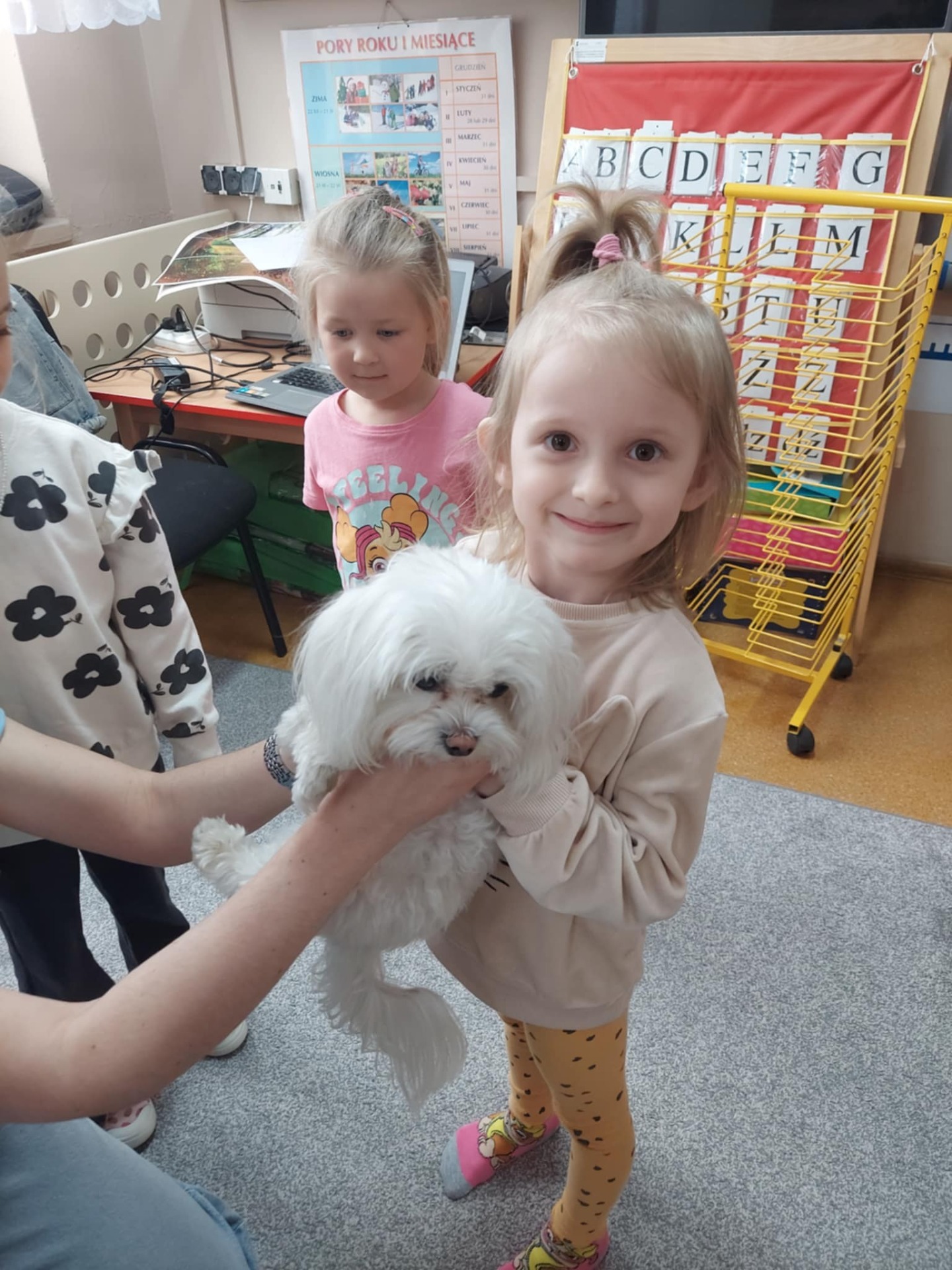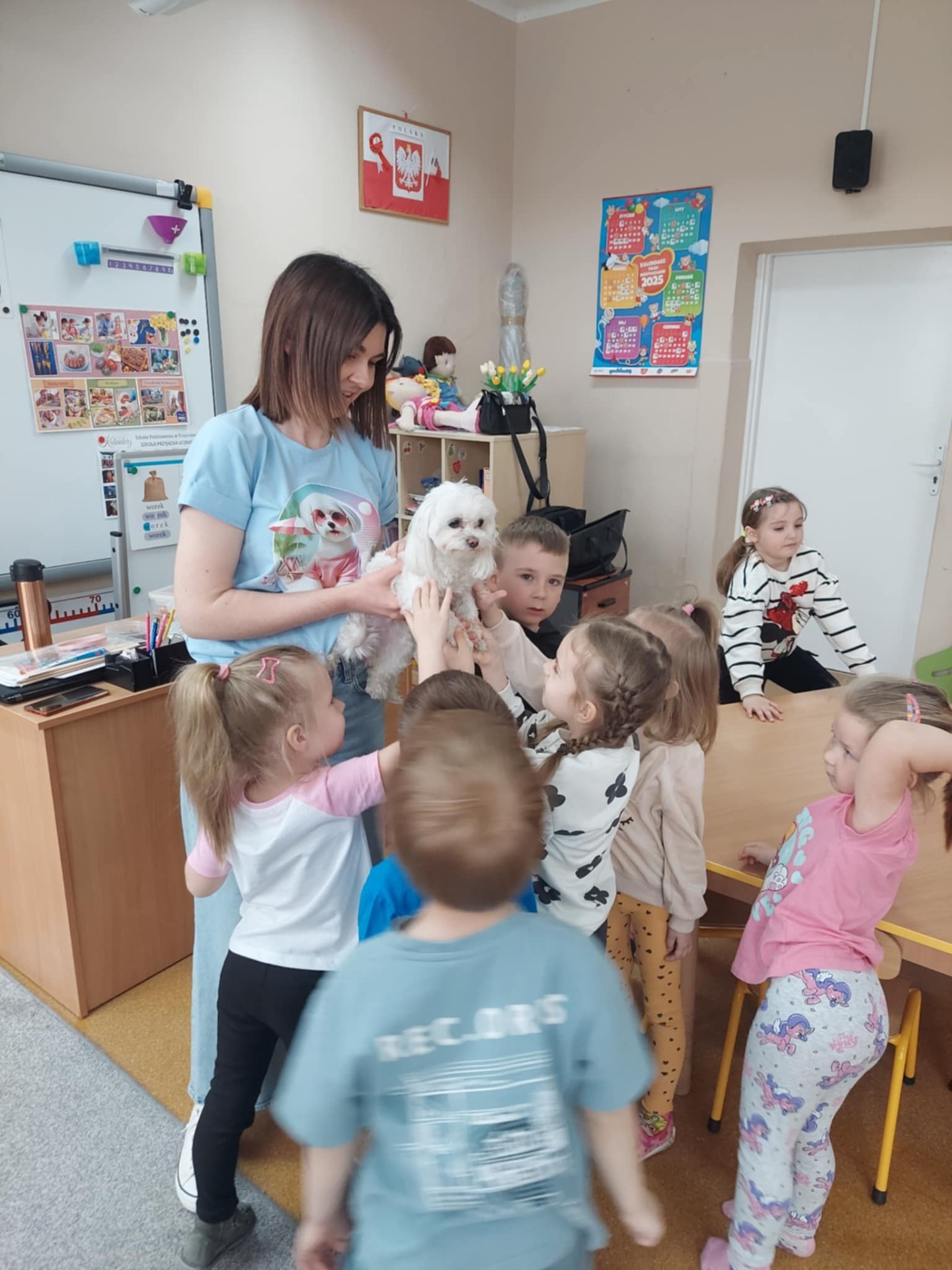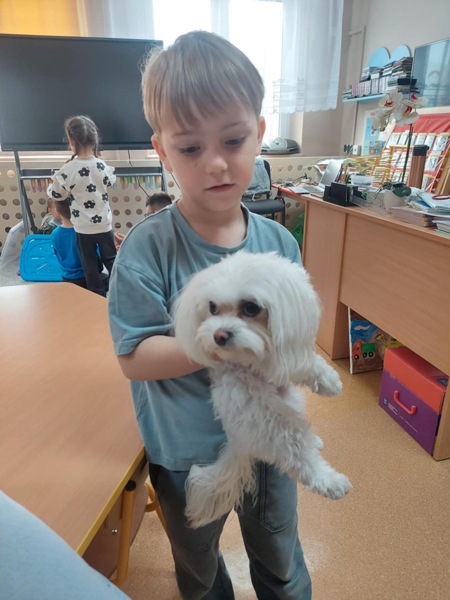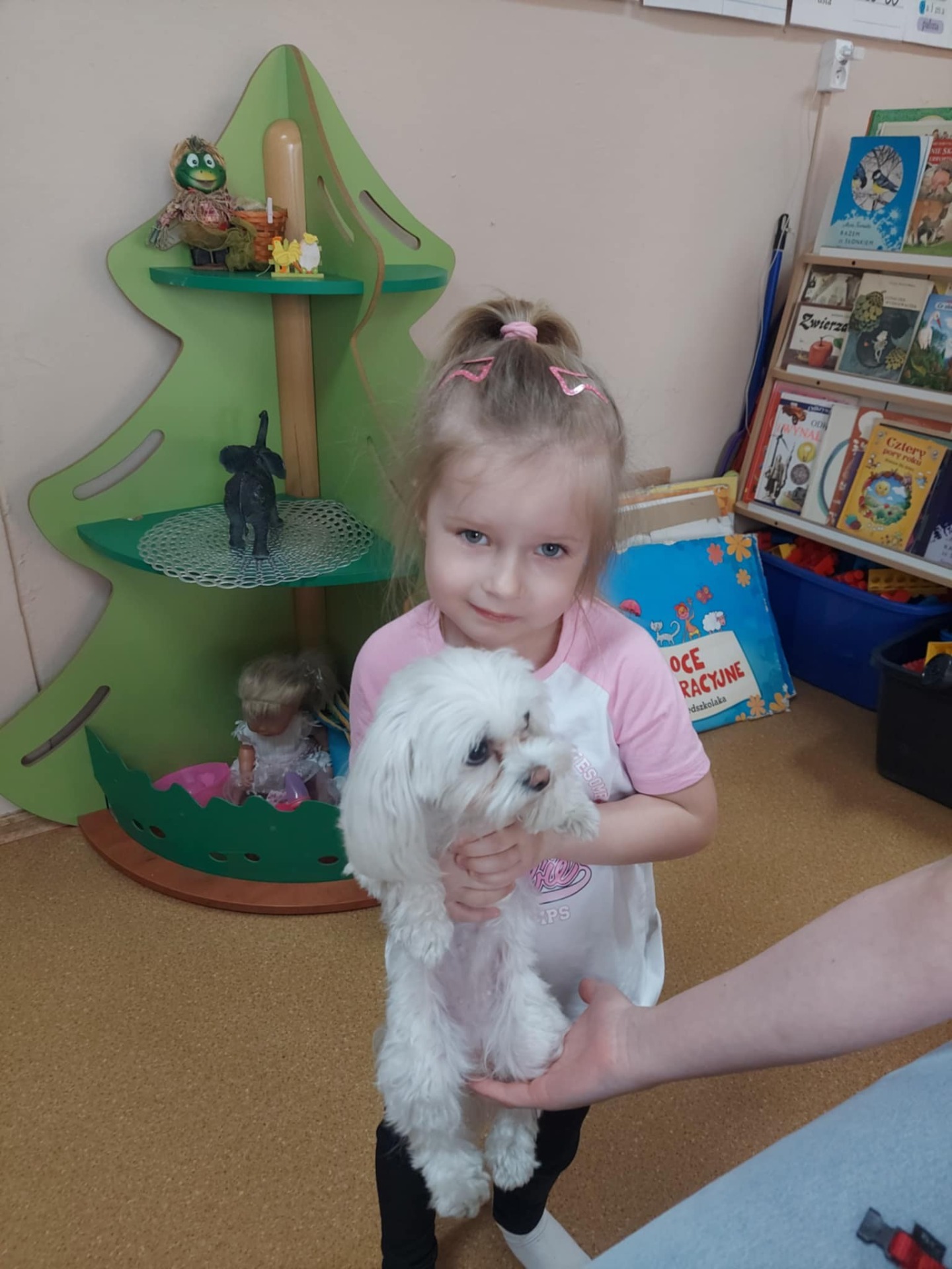 W piątek 25 kwietnia do oddziału przedszkolnego zawitał niecodzienny gość, pies rasy maltańczyk - Luna. Psy mają niezwykłe działanie terapeutyczne, pomagają rozładować emocje, poprawiają nastrój. Dogoterapia uczy samodzielności i odpowiedzialności za siebie i psa. Wpływa na stan emocjonalny, łagodzi stres i samotność, relaksuje. Zajęcia z psem uczą również tolerancji do innych i akceptacji siebie samego, takimi, jacy jesteśmy. Wizyta małej Luny wniosła wiele radości do naszej grupy.