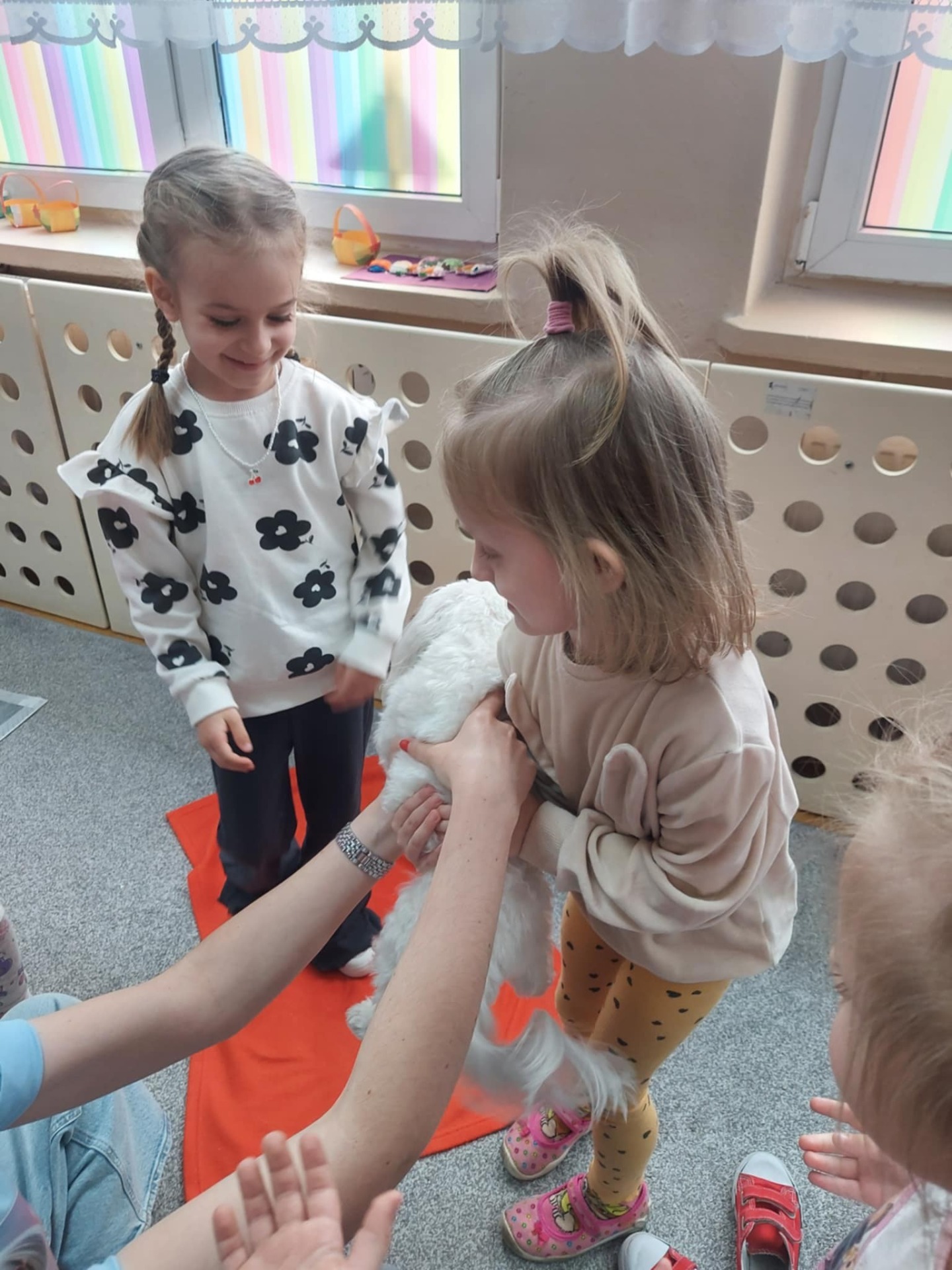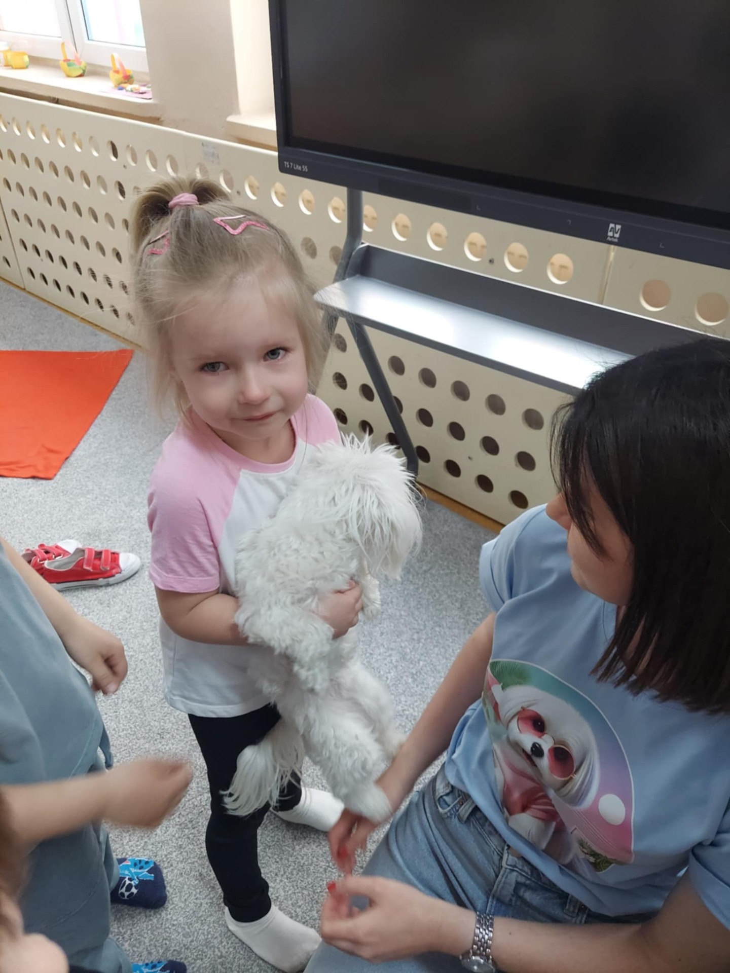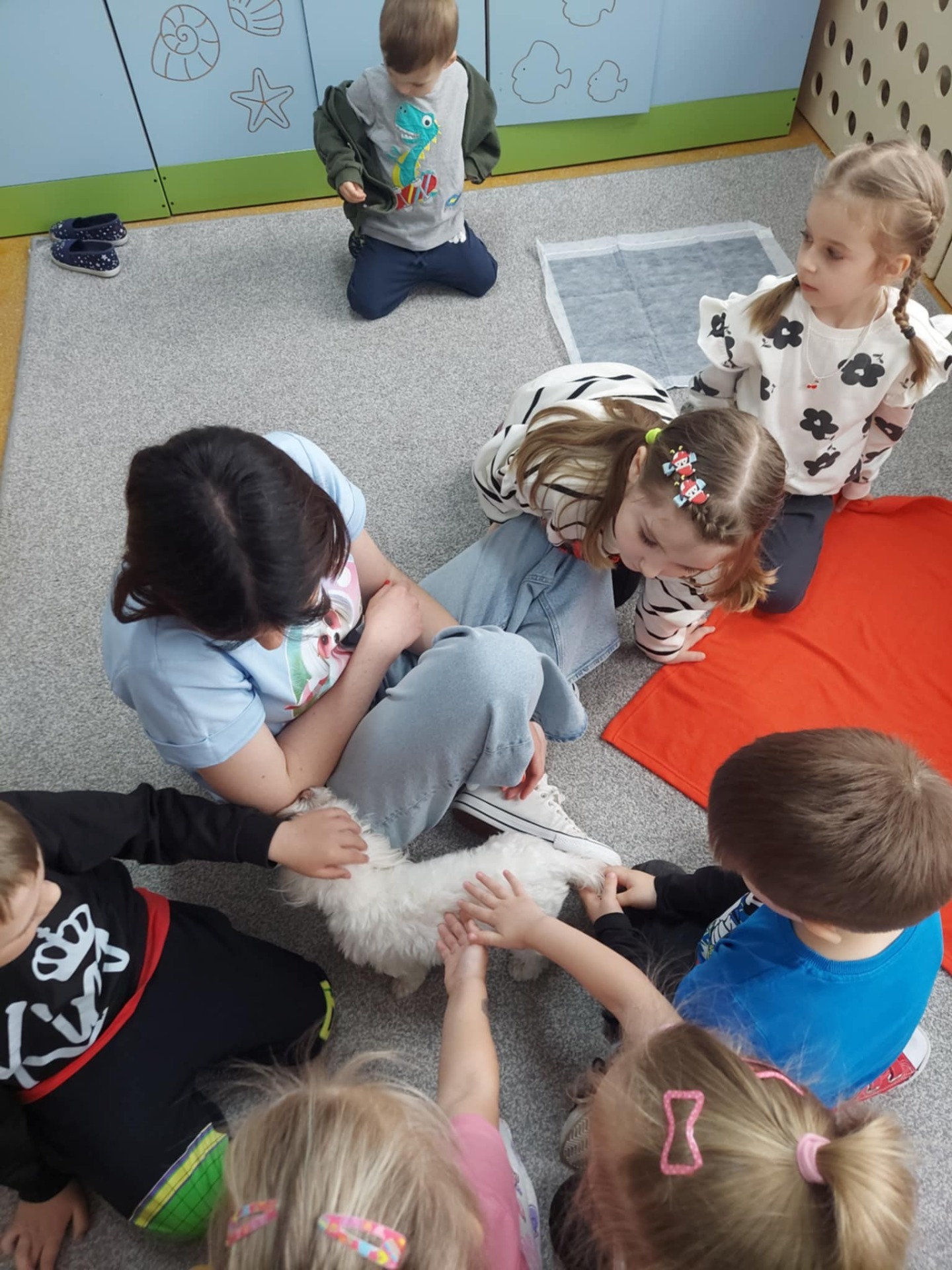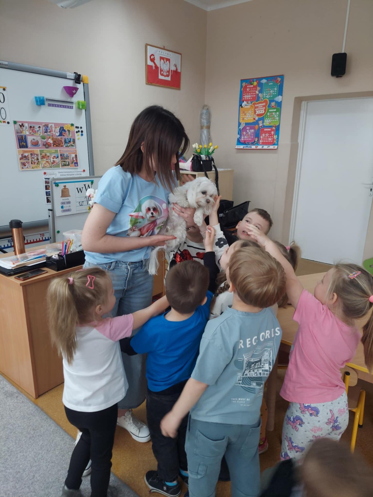 W piątek 25 kwietnia do oddziału przedszkolnego zawitał niecodzienny gość, pies rasy maltańczyk - Luna. Psy mają niezwykłe działanie terapeutyczne, pomagają rozładować emocje, poprawiają nastrój. Dogoterapia uczy samodzielności i odpowiedzialności za siebie i psa. Wpływa na stan emocjonalny, łagodzi stres i samotność, relaksuje. Zajęcia z psem uczą również tolerancji do innych i akceptacji siebie samego, takimi, jacy jesteśmy. Wizyta małej Luny wniosła wiele radości do naszej grupy.