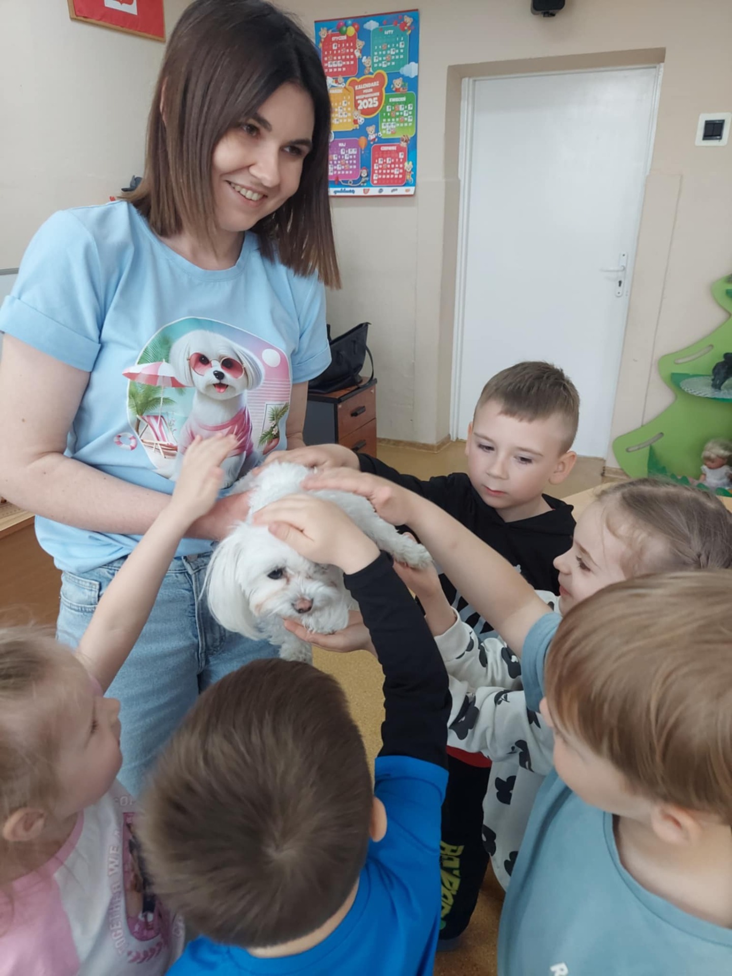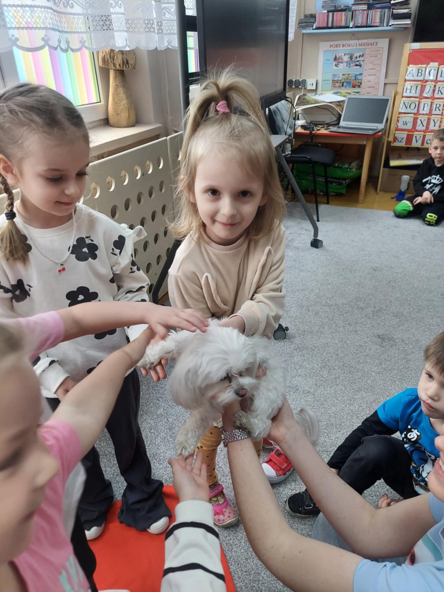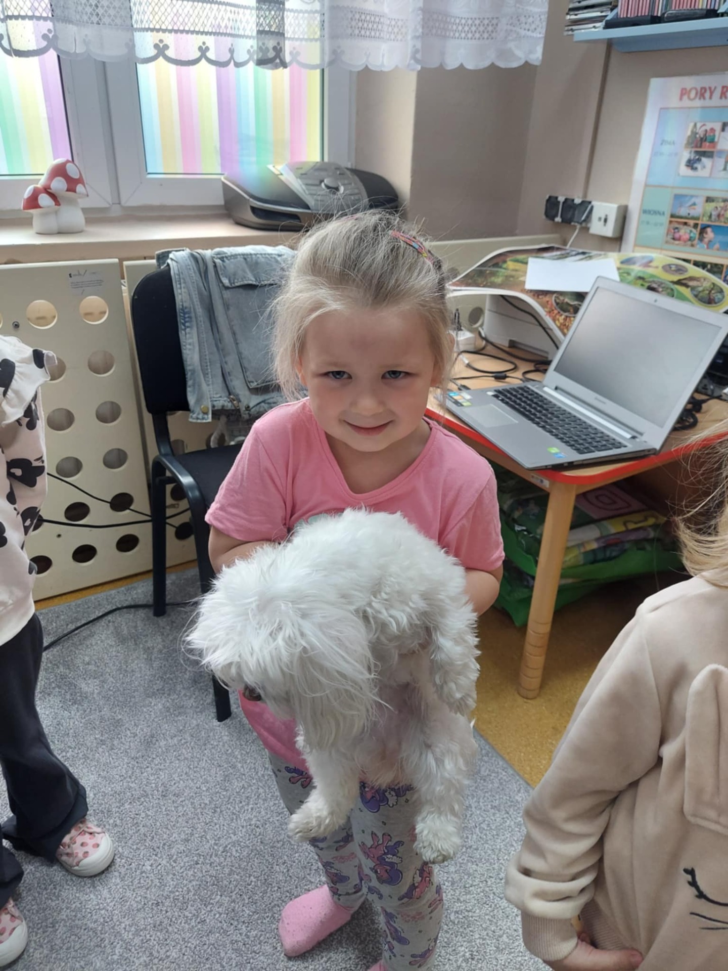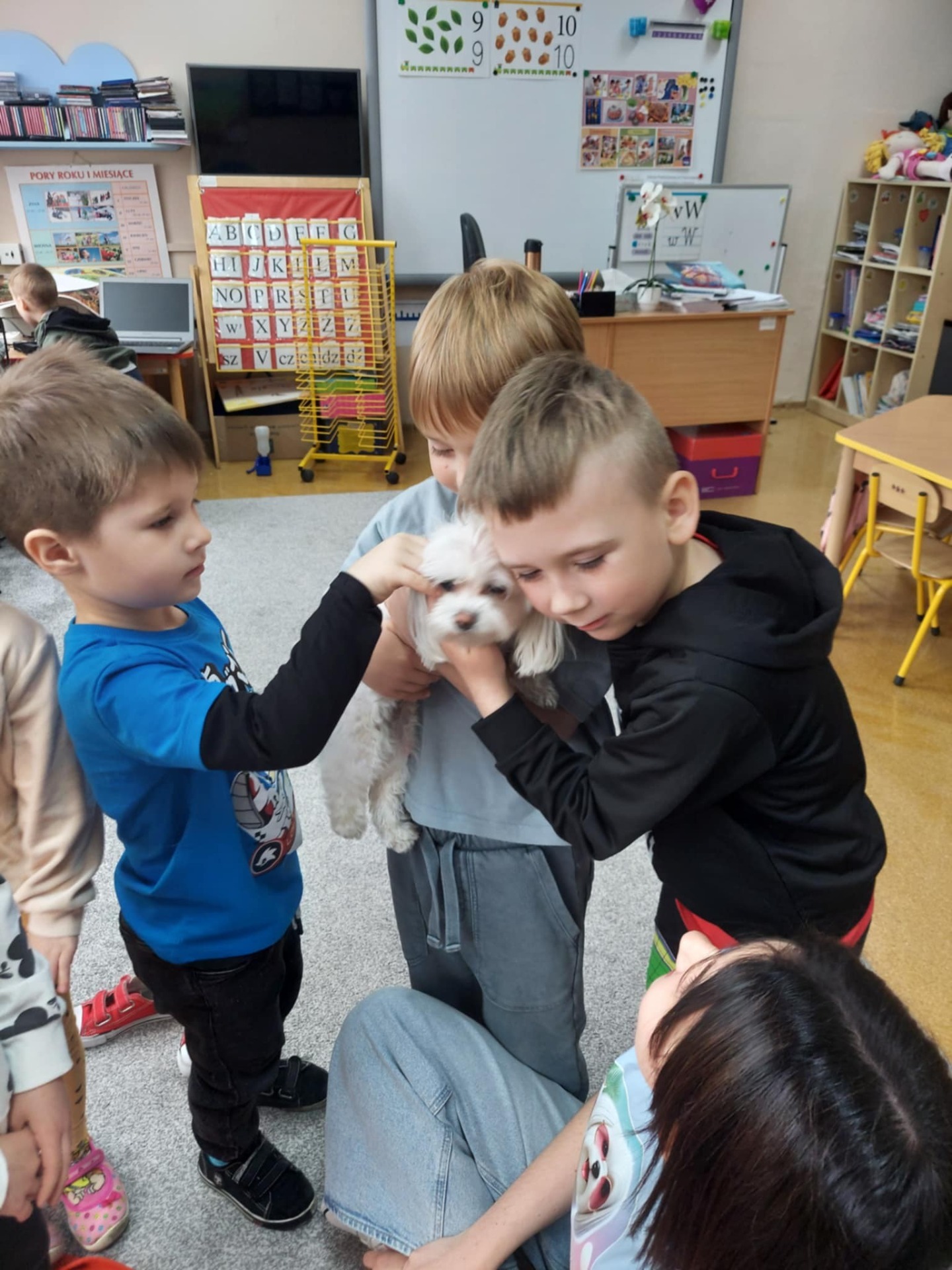 W piątek 25 kwietnia do oddziału przedszkolnego zawitał niecodzienny gość, pies rasy maltańczyk - Luna. Psy mają niezwykłe działanie terapeutyczne, pomagają rozładować emocje, poprawiają nastrój. Dogoterapia uczy samodzielności i odpowiedzialności za siebie i psa. Wpływa na stan emocjonalny, łagodzi stres i samotność, relaksuje. Zajęcia z psem uczą również tolerancji do innych i akceptacji siebie samego, takimi, jacy jesteśmy. Wizyta małej Luny wniosła wiele radości do naszej grupy.