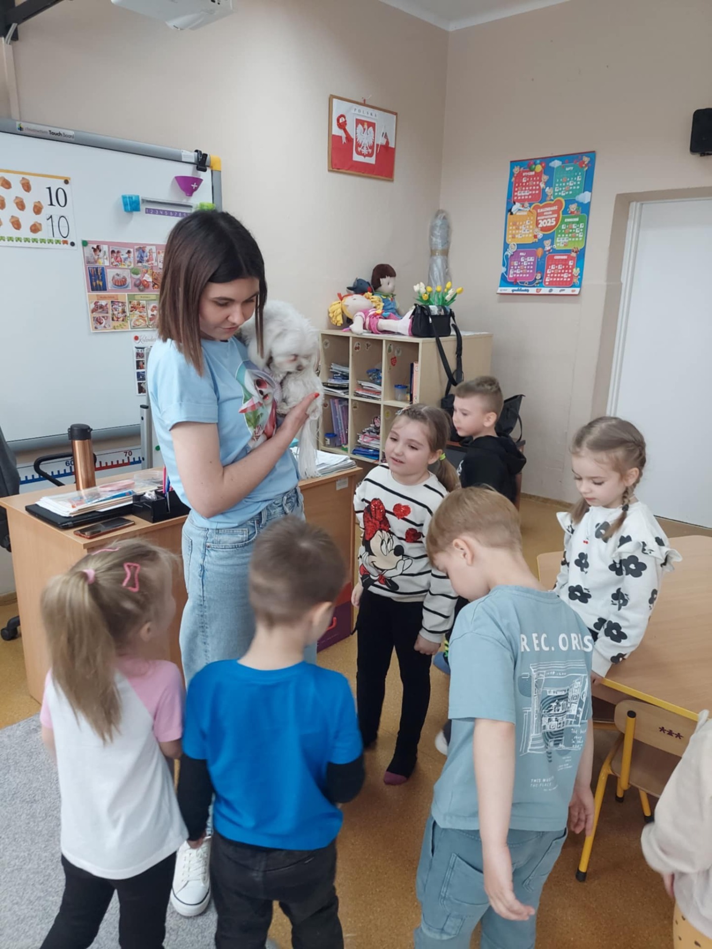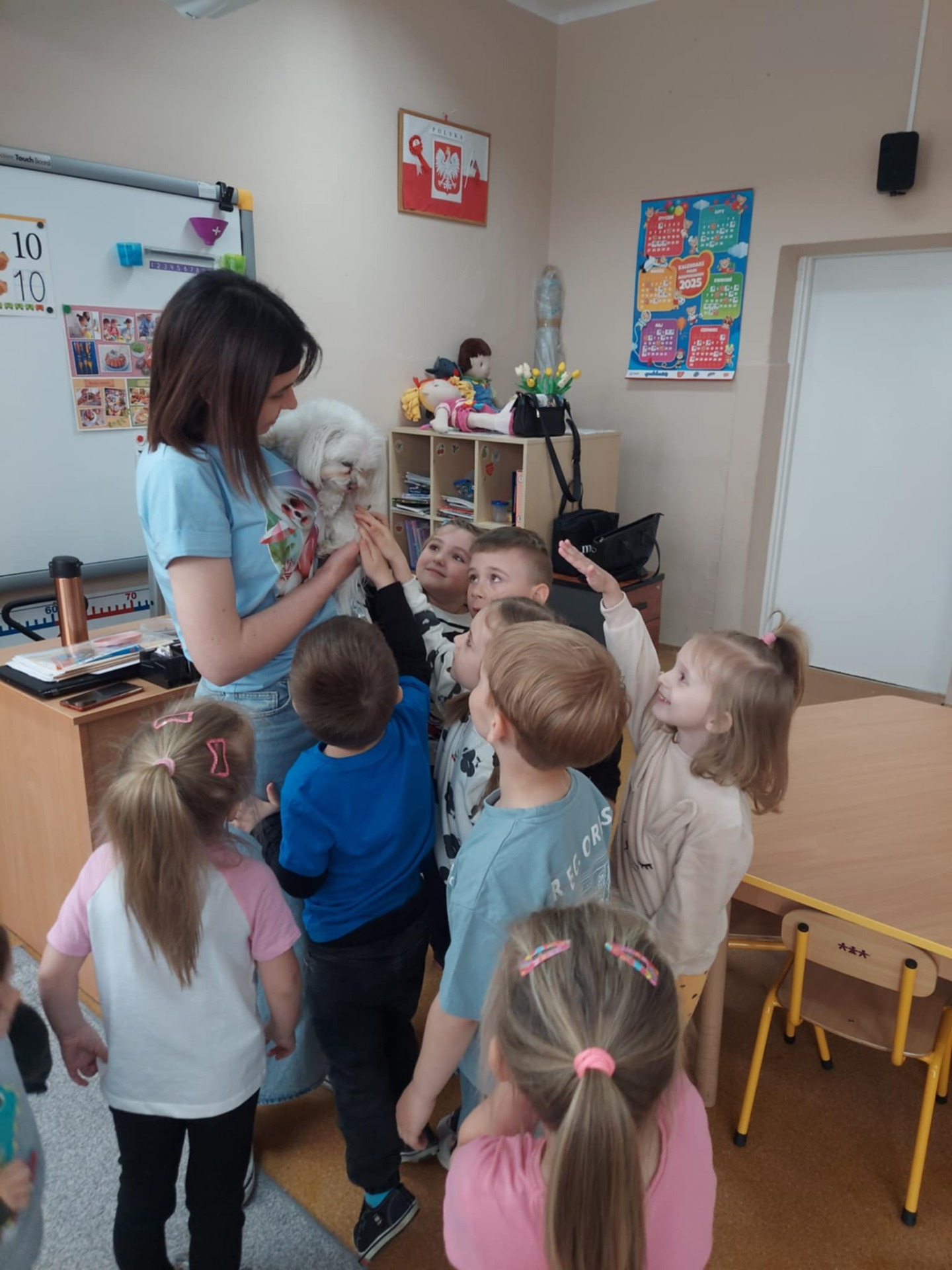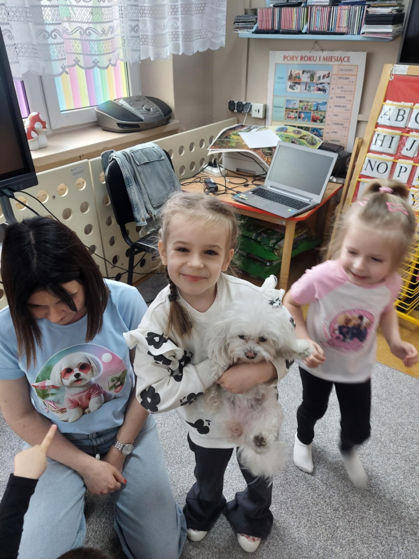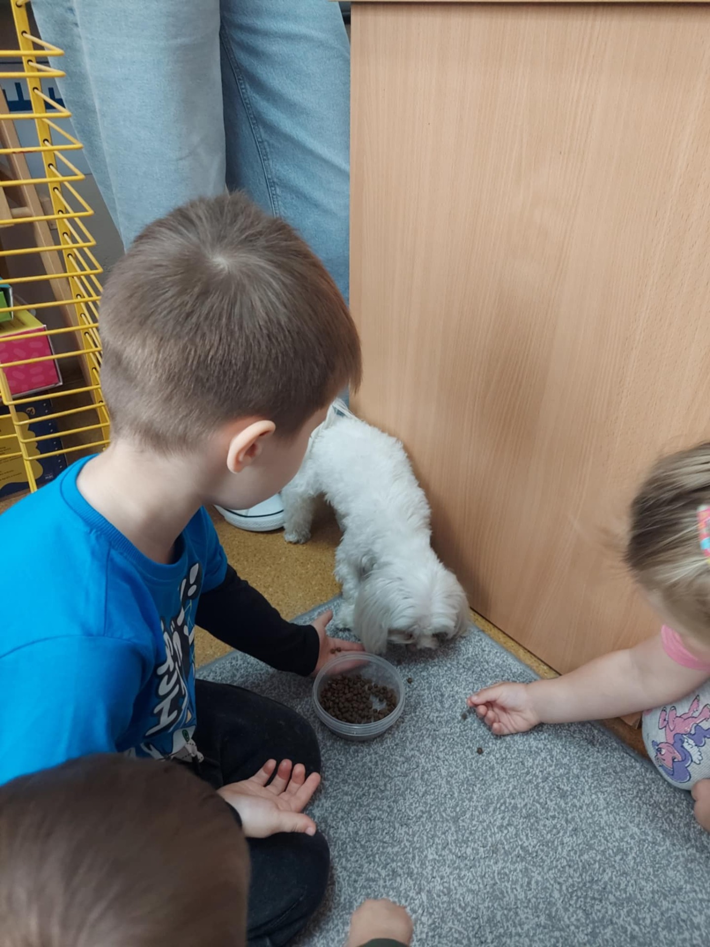 W piątek 25 kwietnia do oddziału przedszkolnego zawitał niecodzienny gość, pies rasy maltańczyk - Luna. Psy mają niezwykłe działanie terapeutyczne, pomagają rozładować emocje, poprawiają nastrój. Dogoterapia uczy samodzielności i odpowiedzialności za siebie i psa. Wpływa na stan emocjonalny, łagodzi stres i samotność, relaksuje. Zajęcia z psem uczą również tolerancji do innych i akceptacji siebie samego, takimi, jacy jesteśmy. Wizyta małej Luny wniosła wiele radości do naszej grupy.