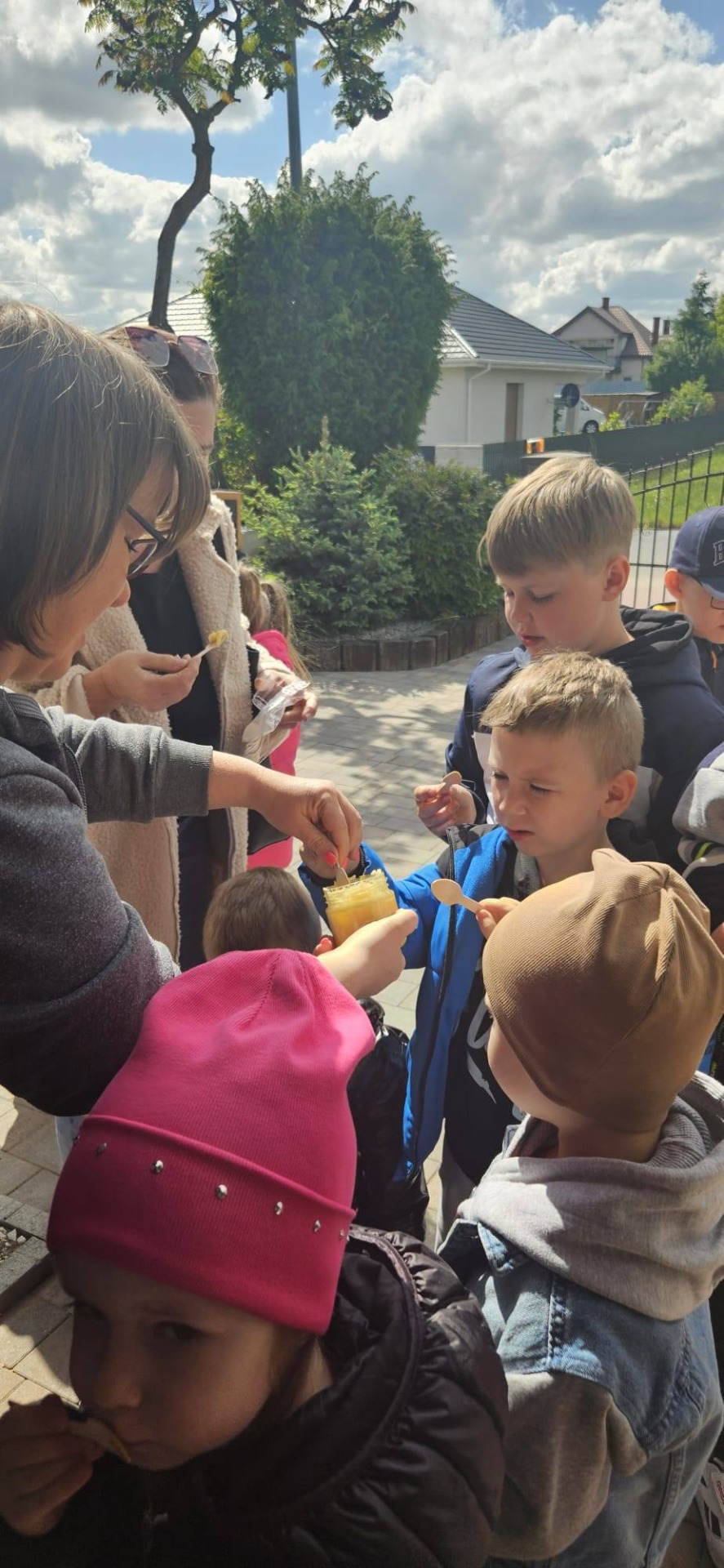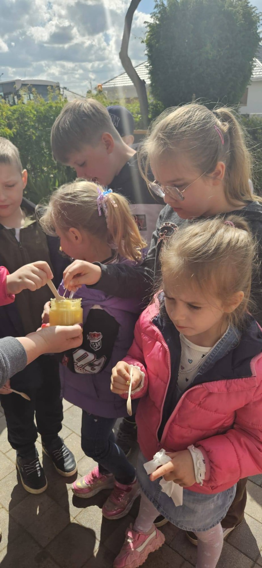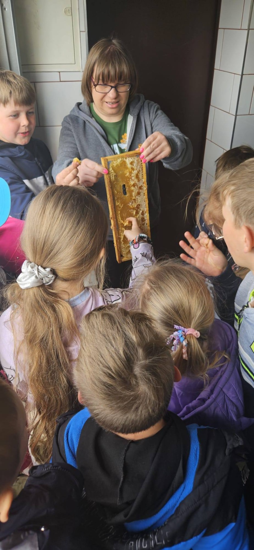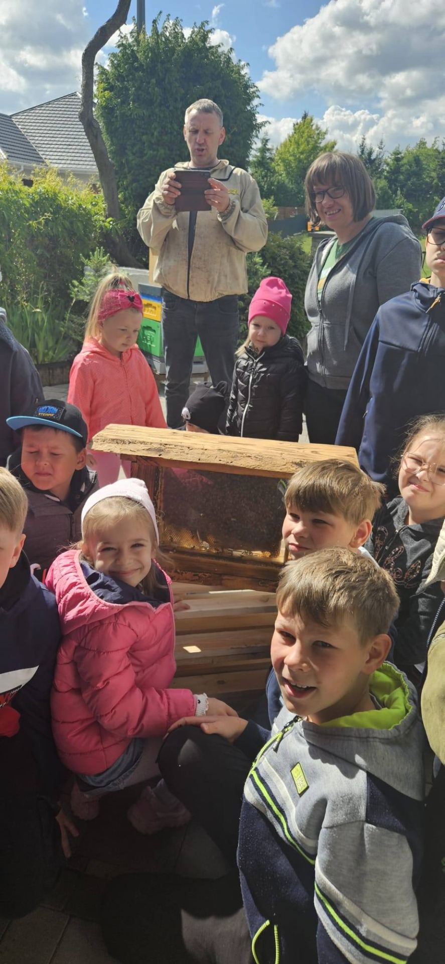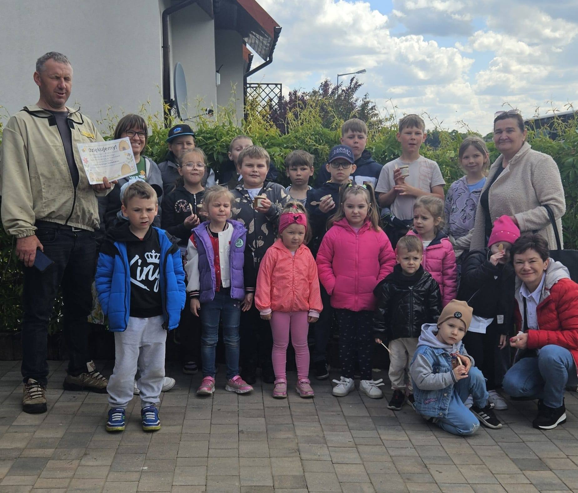 Dnia 12 maja 2025r. dzieci z oddziału przedszkolnego i uczniowie klas I-III wraz z wychowawcami wybrali się z wizytą do pasieki „Miodowa Kraina” prowadzonej przez państwa Sylwię i Karola Stefańskich. Celem wizyty było poznanie życia pszczół, trudnej pracy pszczelarza, procesów zachodzących w ulu, docenienie walorów zdrowotnych, odżywczych oraz smakowych miodu i jego pochodnych (propolis, pyłek, wosk). Dzieci obejrzały różne narzędzia i przedmioty, które pomagają w pracy z pszczołami. Na własne oczy zobaczyły królową pszczół, którą najpierw musiały odnaleźć. Uczniowie mogli też zobaczyć z bliska, jak wygląda wypełniony plaster miodu i samodzielnie zeskrobać wosk. Każdy z nich przymierzył ubranie pszczelarza. Dzieci skosztowały różnych rodzajów miodu. W czasie pobytu w pasiece uśmiech z twarzy nie schodził naszym degustatorom, a ich radość była jeszcze większa, gdy każdy z nich otrzymał słoiczek miodu. Serdecznie dziękujemy państwu Sylwii i Karolowi Stefańskim za miłe i serdeczne przyjęcie, za interesującą i ciekawą lekcję przyrody, która na długo zapadnie w naszej pamięci.