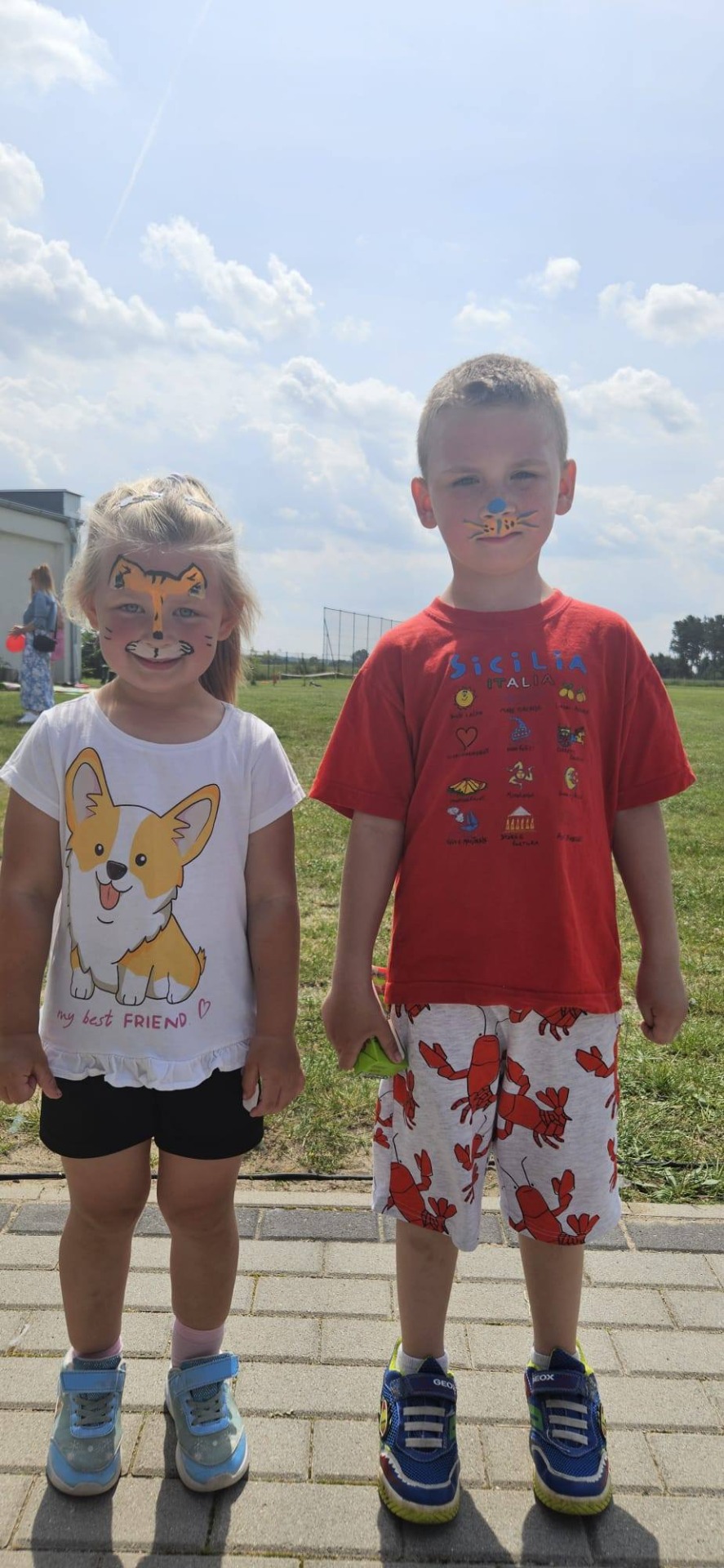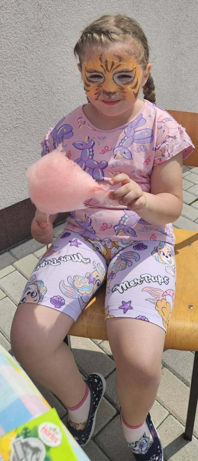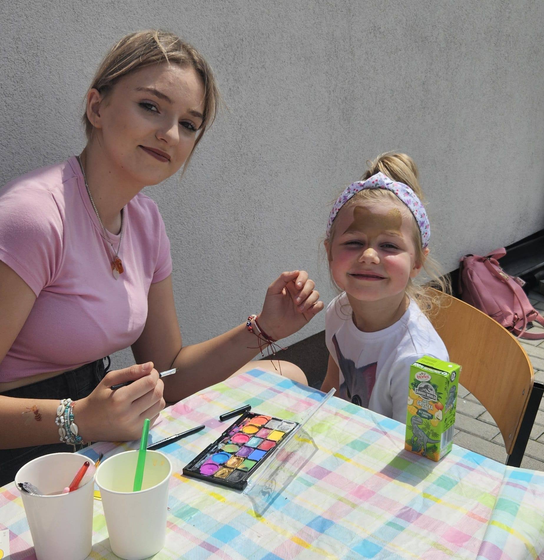 Wśród wielu uśmiechniętych twarzy były też prawdziwe artystki – trzy absolwentki naszej szkoły: Marika, Natalia i Oliwia, które z ogromną cierpliwością i zaangażowaniem malowały buźki najmłodszych uczestników festynu, zamieniając ich w kotki, superbohaterów i bajkowe postacie 🎨💫