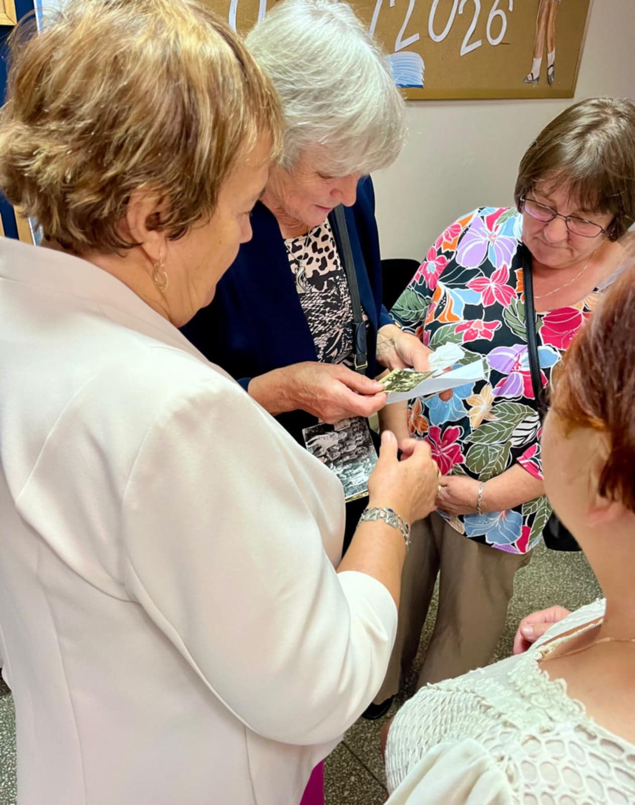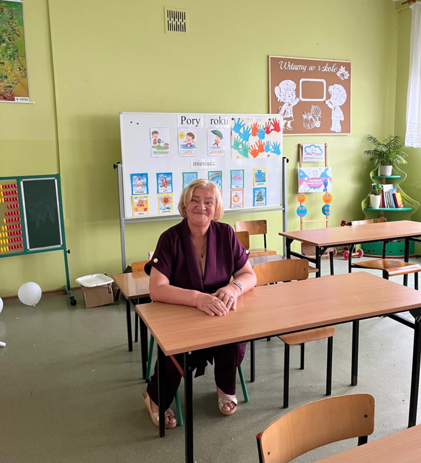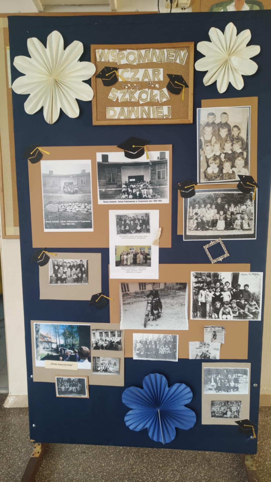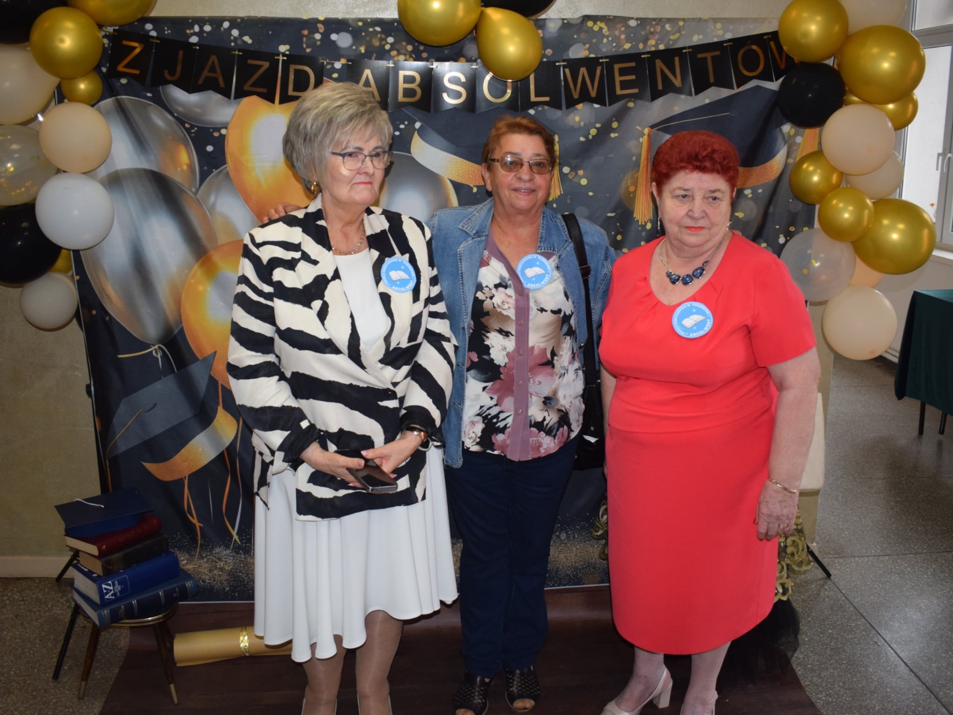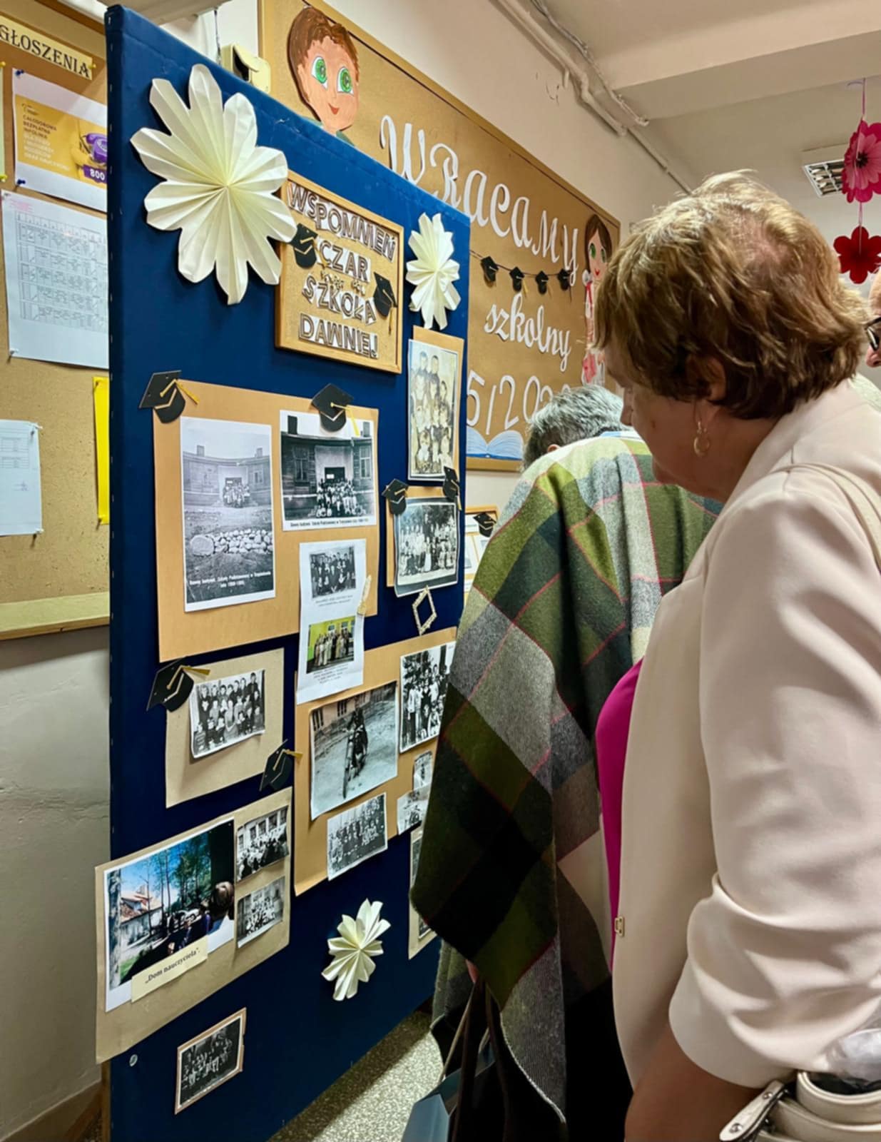 Po obiedzie uczestnicy wykonywali sobie pamiątkowe fotografie — zarówno przed budynkiem szkoły, jak i na specjalnie przygotowanej ściance, która stanowiła idealne tło do wspólnych zdjęć pełnych uśmiechu i wzruszeń.