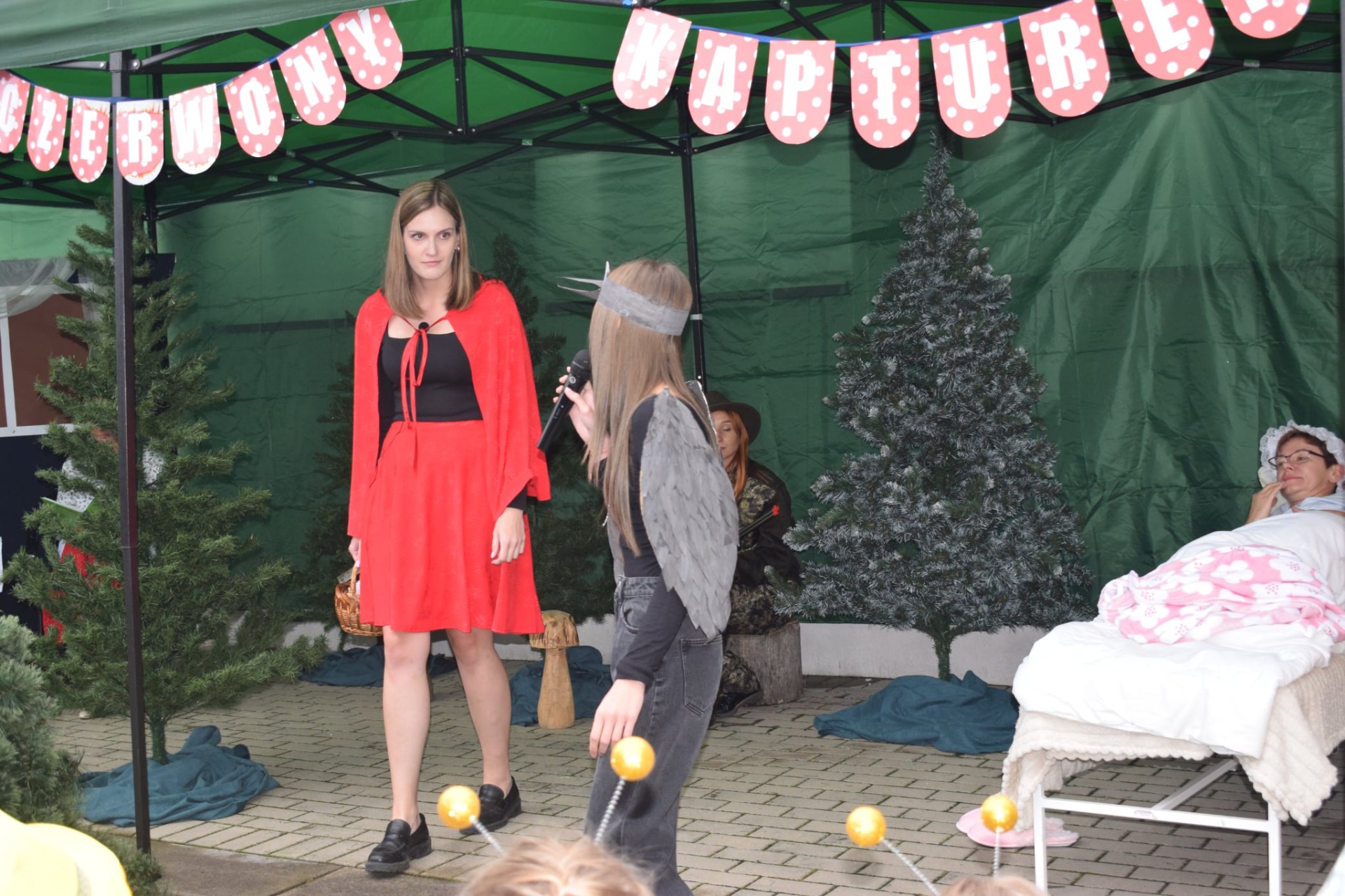 Część artystyczna była pełna emocji i uśmiechu. Dzieci z oddziału przedszkolnego, wspólnie z nauczycielkami, zaprezentowały inscenizowaną piosenkę o Pszczółce Mai, która oczarowała publiczność swoją uroczą choreografią i kolorowymi strojami. Następnie uczniowie wraz z nauczycielami wystąpili w humorystycznym przedstawieniu pt. „Zbuntowany Czerwony Kapturek”, które wywołało salwy śmiechu i gromkie brawa.