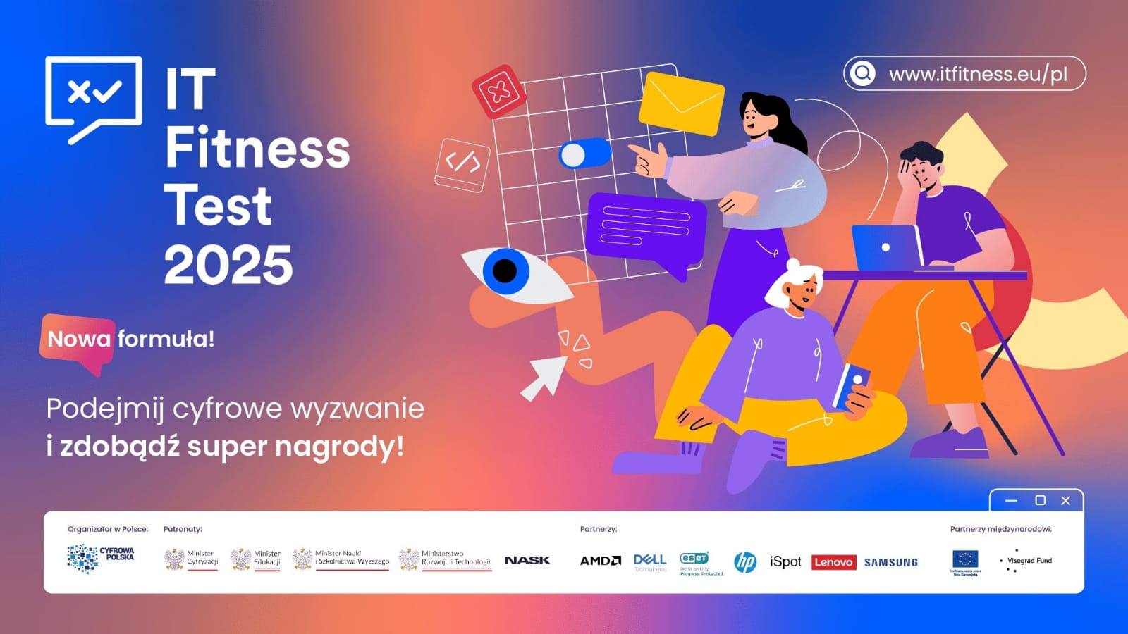 Projekt IT Fitness Test realizowany jest przez Związek Cyfrowa Polska, przy wsparciu ministerstw: cyfryzacji, edukacji, nauki i szkolnictwa wyższego oraz rozwoju i technologii