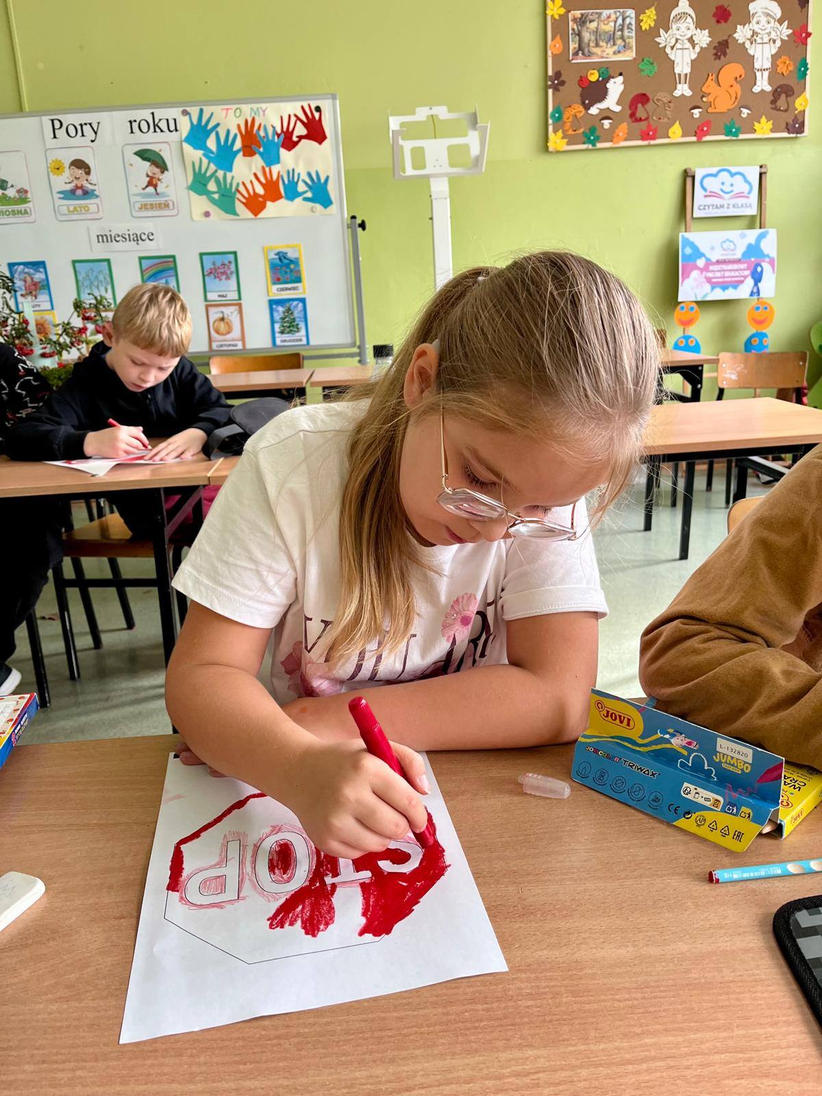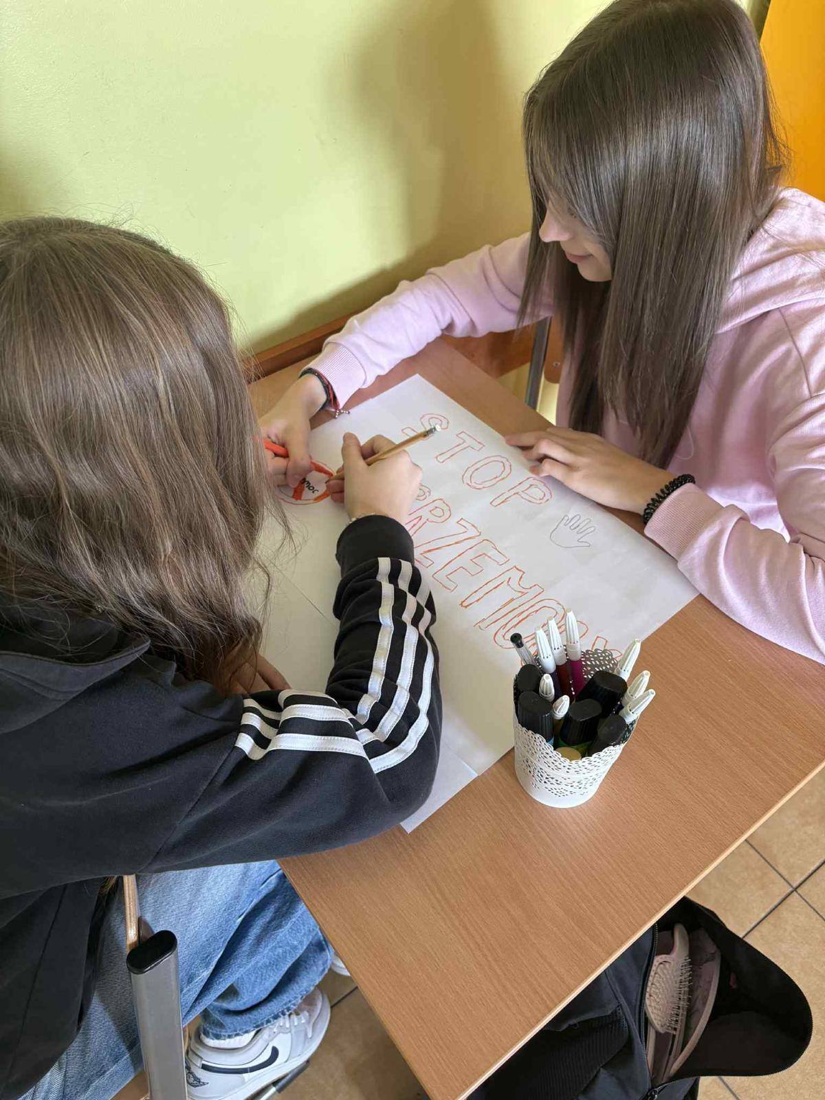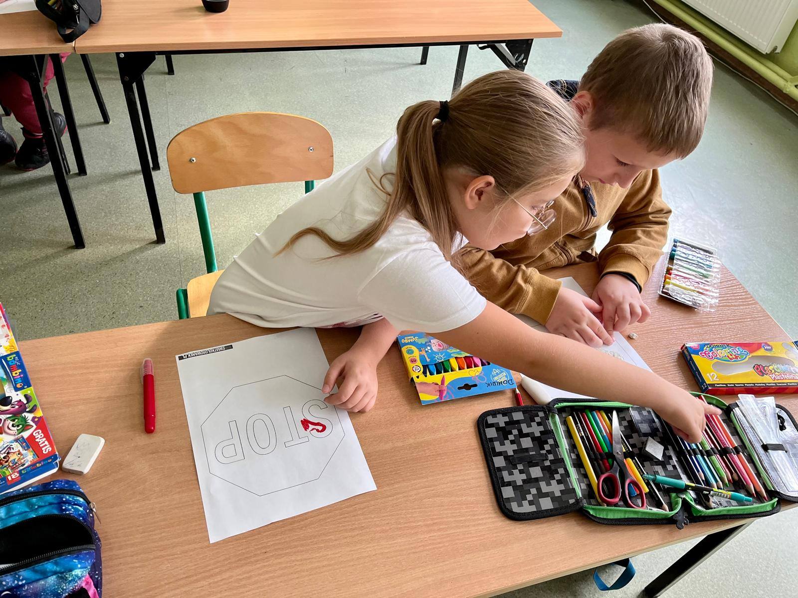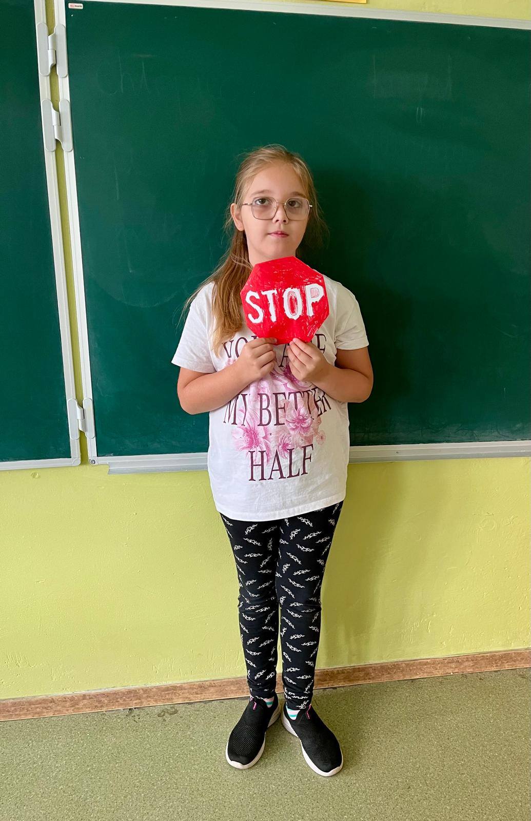W kolejnych dniach uczniowie uczestniczyli w zajęciach profilaktycznych, podczas których tworzyli plakaty z ważnymi przesłaniami o przeciwdziałaniu przemocy. Nie zabrakło też wspólnych aktywności – zabawy z włóczką, która uczyła współpracy, oraz tańca integracyjnego, który wprowadził wszystkich w doskonały nastrój. Dzieci kolorowały również znak STOP jako symbol sprzeciwu wobec przemocy – prosty, ale bardzo wymowny gest.