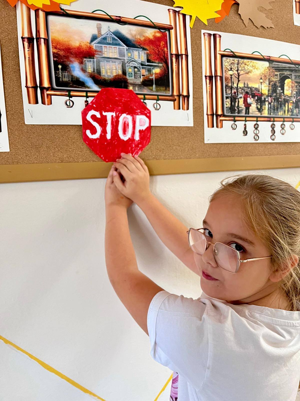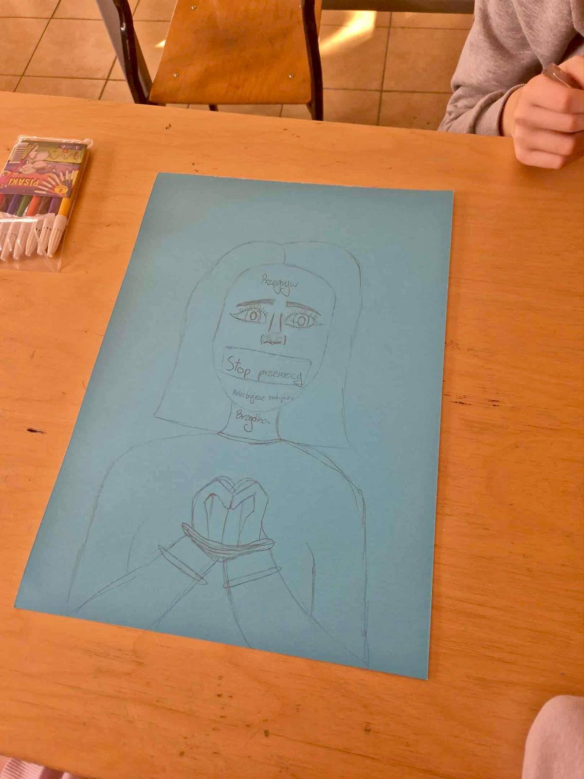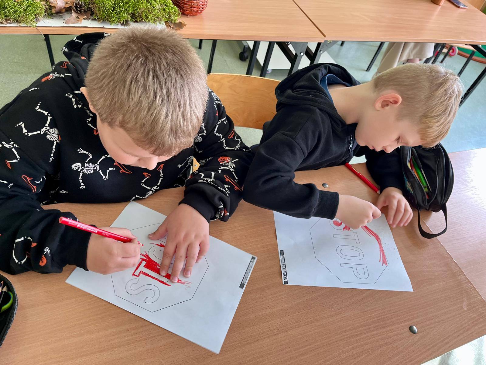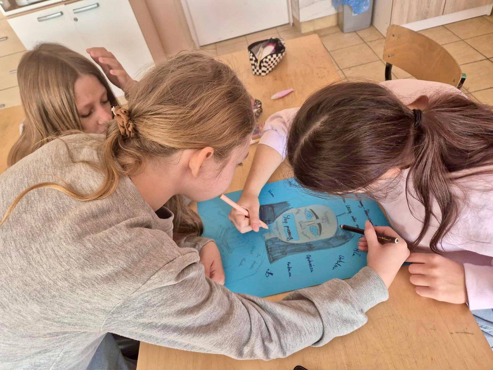 W kolejnych dniach uczniowie uczestniczyli w zajęciach profilaktycznych, podczas których tworzyli plakaty z ważnymi przesłaniami o przeciwdziałaniu przemocy. Nie zabrakło też wspólnych aktywności – zabawy z włóczką, która uczyła współpracy, oraz tańca integracyjnego, który wprowadził wszystkich w doskonały nastrój. Dzieci kolorowały również znak STOP jako symbol sprzeciwu wobec przemocy – prosty, ale bardzo wymowny gest.