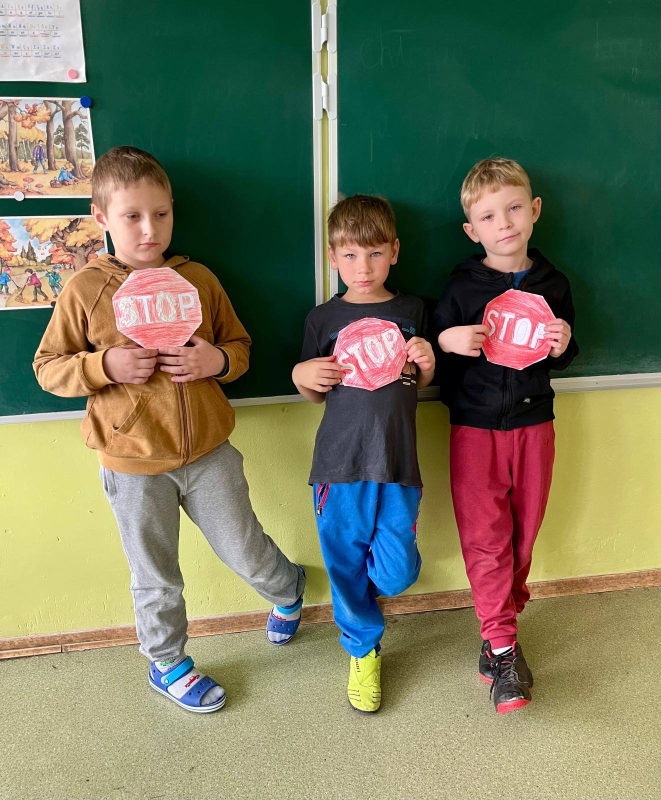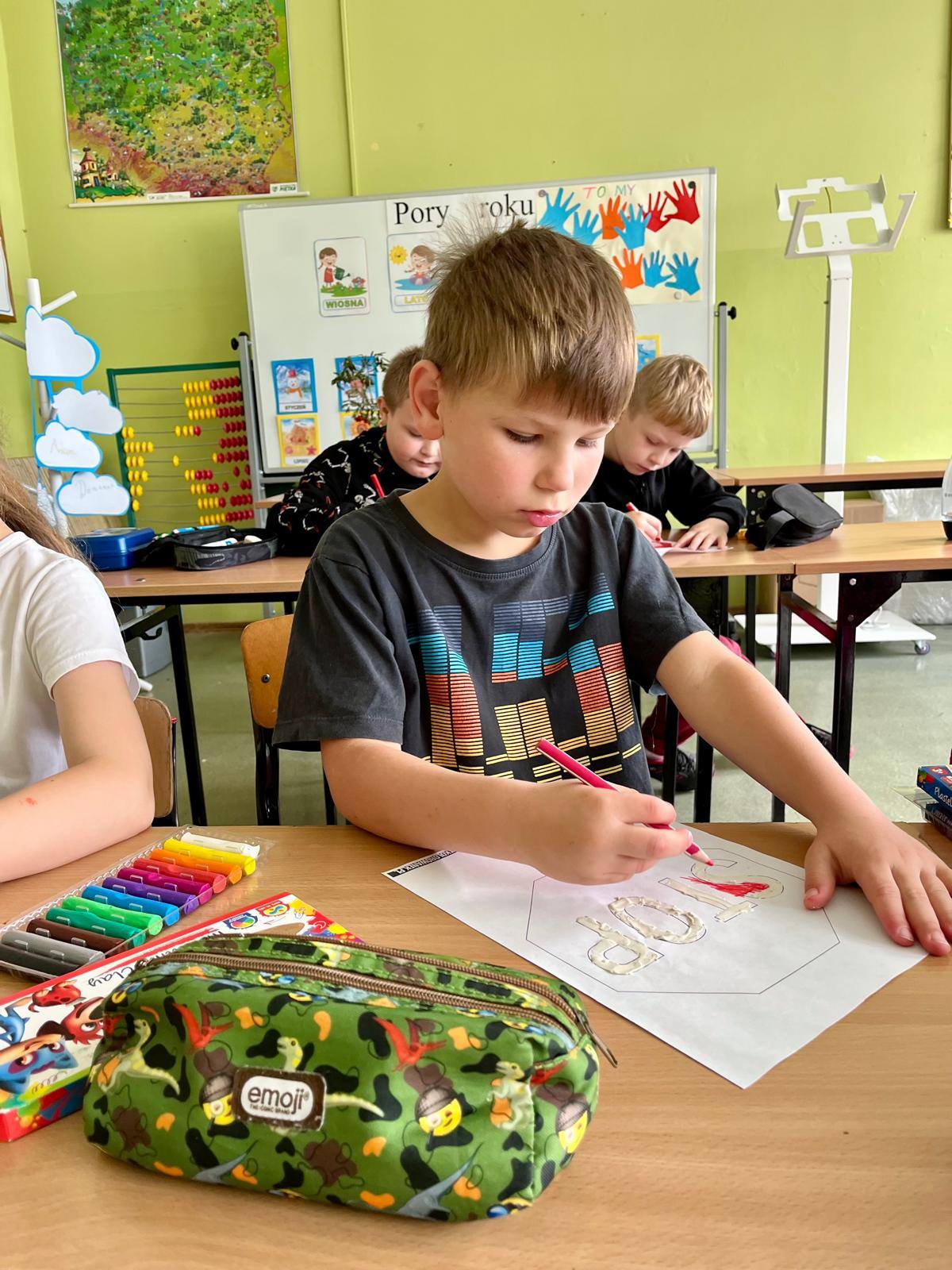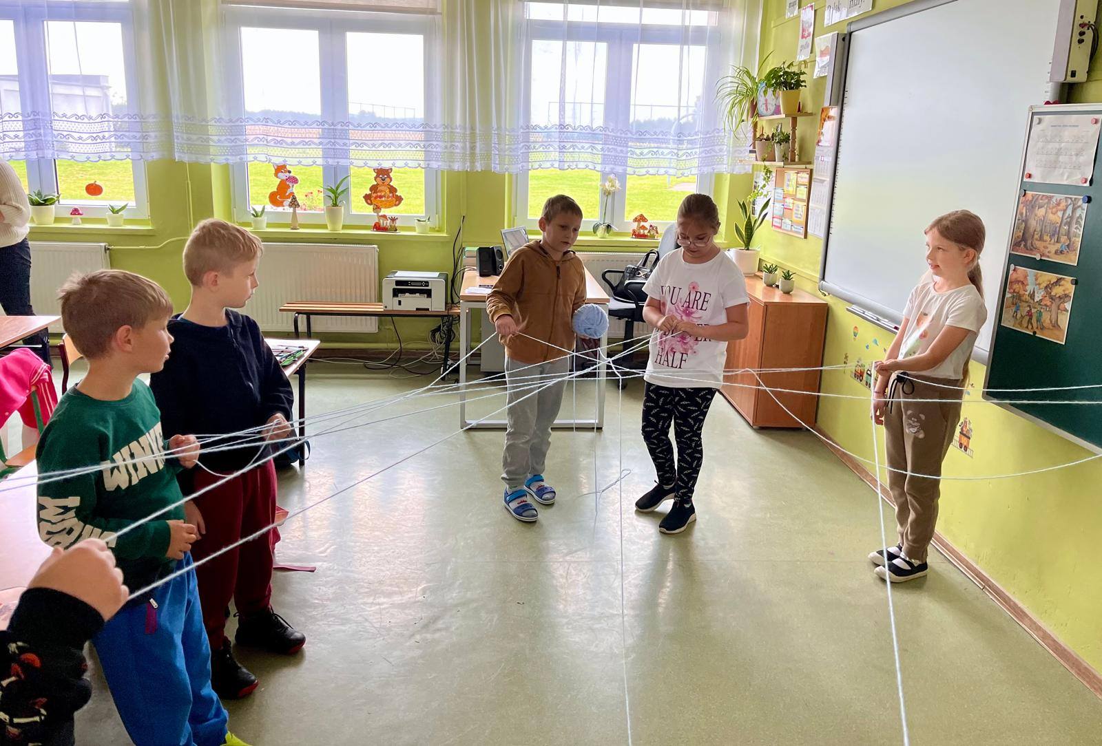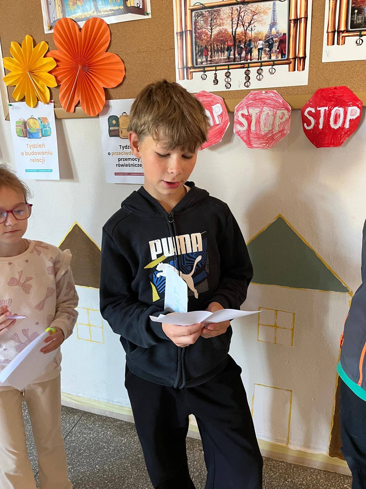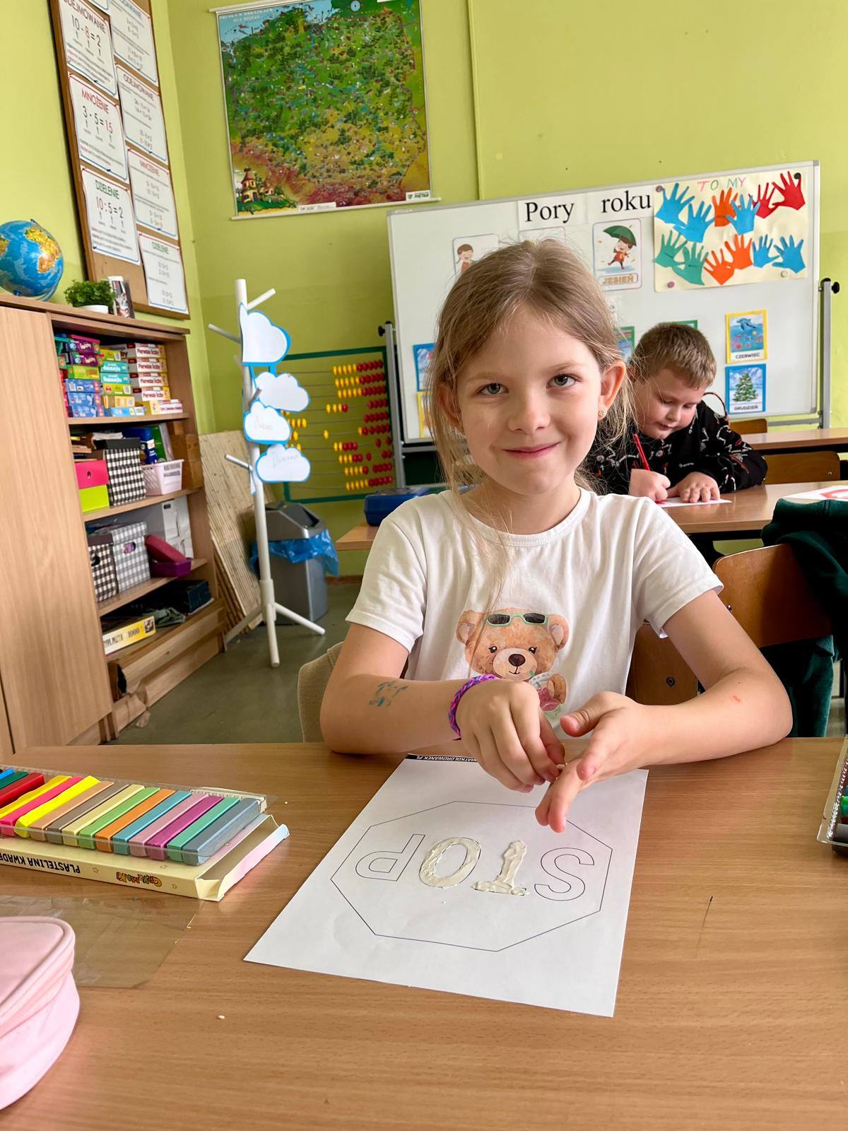 W kolejnych dniach uczniowie uczestniczyli w zajęciach profilaktycznych, podczas których tworzyli plakaty z ważnymi przesłaniami o przeciwdziałaniu przemocy. Nie zabrakło też wspólnych aktywności – zabawy z włóczką, która uczyła współpracy, oraz tańca integracyjnego, który wprowadził wszystkich w doskonały nastrój. Dzieci kolorowały również znak STOP jako symbol sprzeciwu wobec przemocy – prosty, ale bardzo wymowny gest.
