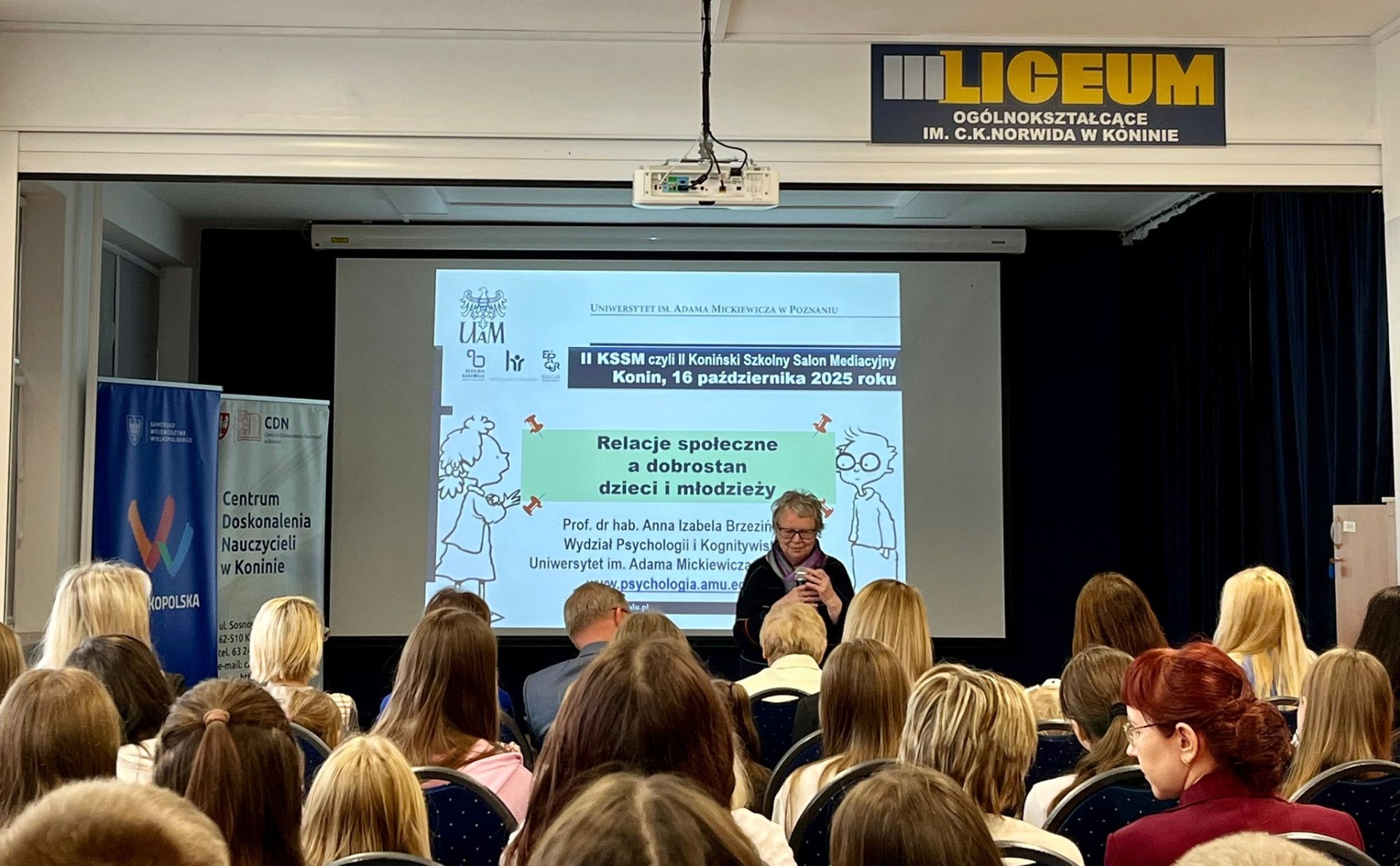 II Koniński Szkolny Salon Mediacyjny 16 października 2025 r. przedstawiciele naszej szkoły wzięli udział w II Konińskim Szkolnym Salonie Mediacyjnym, który odbył się w III Liceum Ogólnokształcącym im. Cypriana Kamila Norwida w Koninie. Spotkanie poświęcone było tematyce relacji i dobrostanu dzieci oraz młodzieży. Wysłuchaliśmy inspirującego wykładu prof. Anny Brzezińskiej, a następnie wzięliśmy udział w warsztatach skierowanych do dyrektorów szkół, nauczycieli, pedagogów, psychologów, mediatorów szkolnych oraz uczniów – mediatorów rówieśniczych. Była to cenna okazja do refleksji, wymiany doświadczeń i pogłębienia wiedzy na temat wspierania dobrostanu oraz rozwoju mediacji w środowisku szkolnym. Dziękujemy organizatorom za inspirujące wydarzenie! 💬🤝