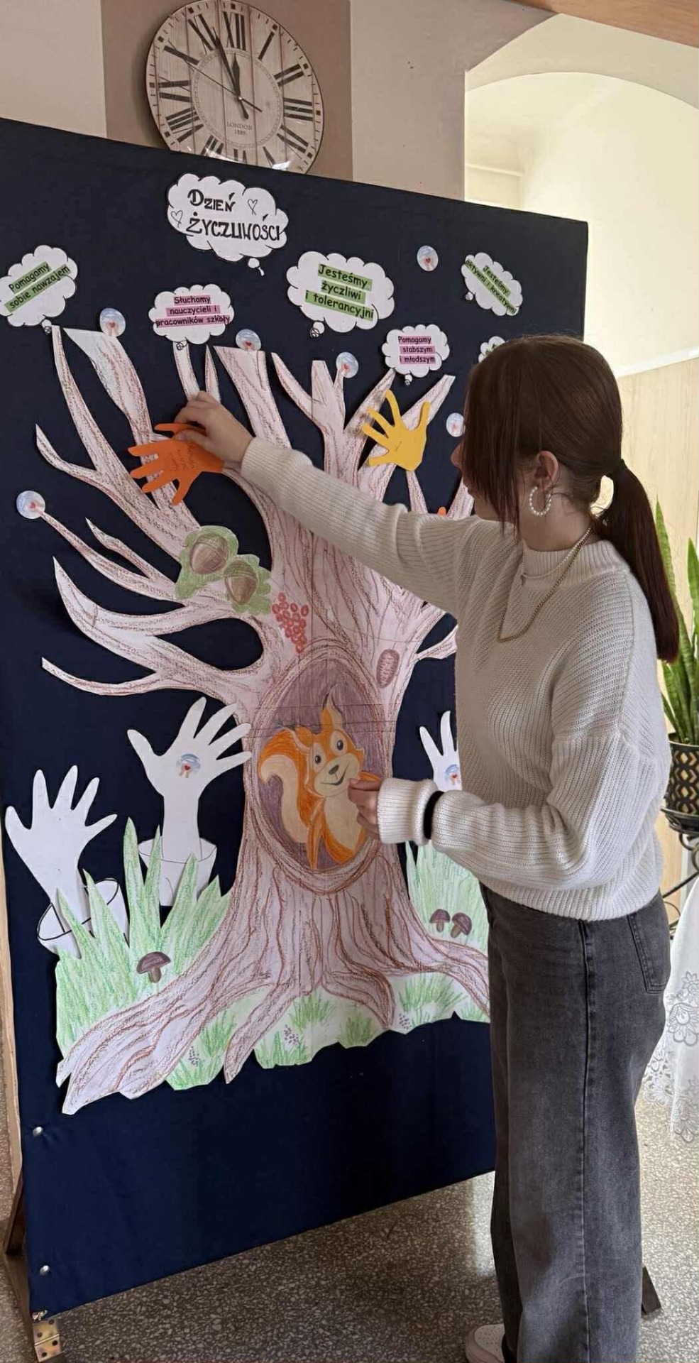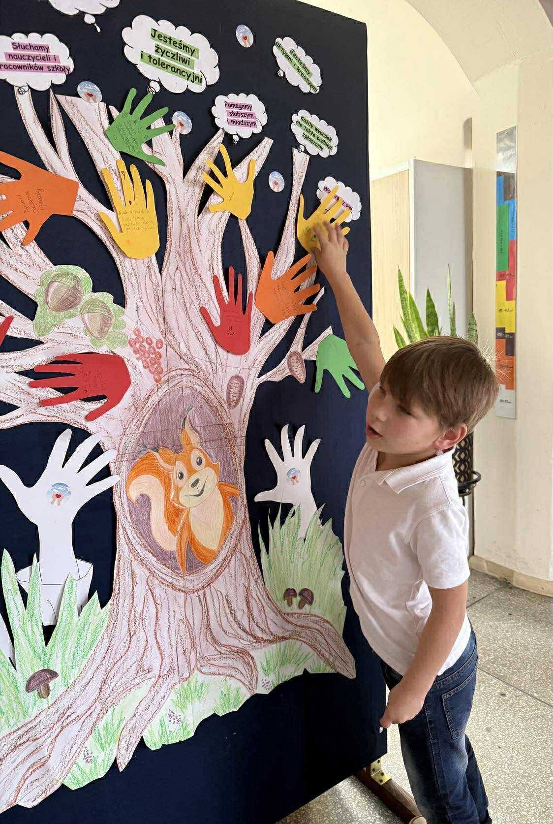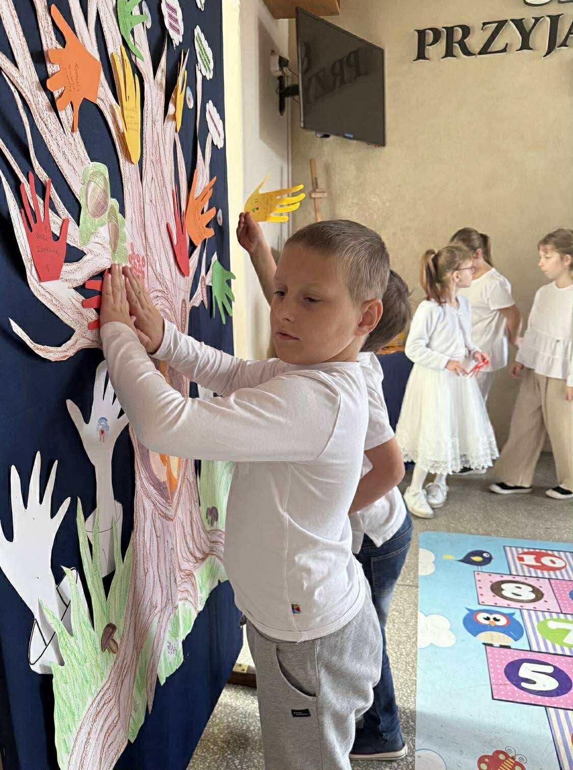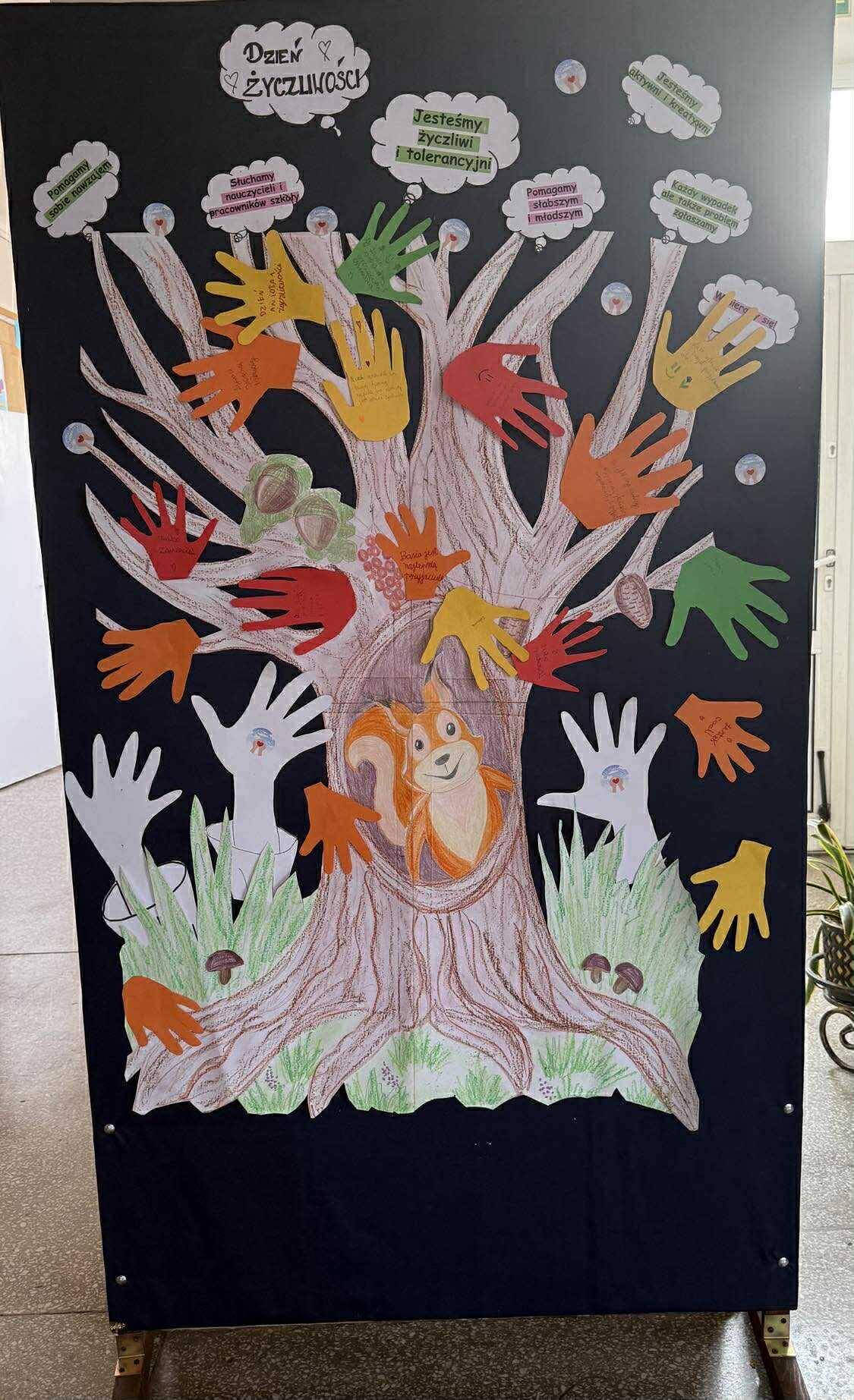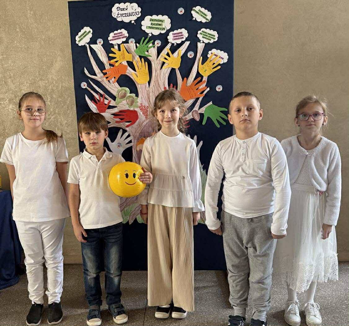 Dnia 19 listopada nasza szkoła przyłączyła się do obchodów Światowego Dnia Życzliwości i Uśmiechu. Tego dnia zorganizowane zostały różnorodne zabawy oraz aktywności, które miały na celu promowanie życzliwości i wzajemnej sympatii wśród uczniów. Jedną z głównych atrakcji były ,,Skrzyneczki życzeń”, do których można było wrzucać liściki z miłymi słowami i życzeniami. Było to miejsce, w którym każdy mógł wyrazić swoje pozytywne myśli i uczucia. Liściki zostaną odczytane w późniejszym terminie, co dodatkowo wzmocni atmosferę radości i oczekiwania. Dla młodszych dzieci zorganizowane były zabawy z piłką ,,uśmiechem”, podczas których uczestnicy rzucali sobie piłeczkę, wymieniając się miłymi słowami. W ramach Dnia Życzliwości i Uśmiechu dzieci miały również okazję wykazać się twórczością. Uczniowie wycinali swoje rączki z kolorowego papieru, na których pisali miłe słowa oraz pozytywne przesłania. Następnie rączki zostały zawieszone na „Drzewie Życzliwości”, które stanęło na szkolnym korytarzu. Drzewo stało się piękną dekoracją, a jednocześnie symbolem wspólnoty i serdeczności, która panuje w naszej szkole. Każda rączka z miłym słowem przypominała wszystkim o sile życzliwości oraz o tym, jak ważne jest dzielenie się dobrem z innymi. Dzieci były dumne z efektów swojej pracy, a drzewo z rączkami stało się miejscem, które przyciąga uwagę.