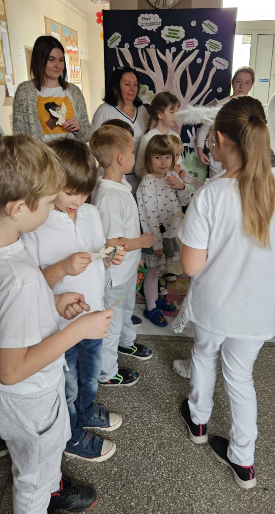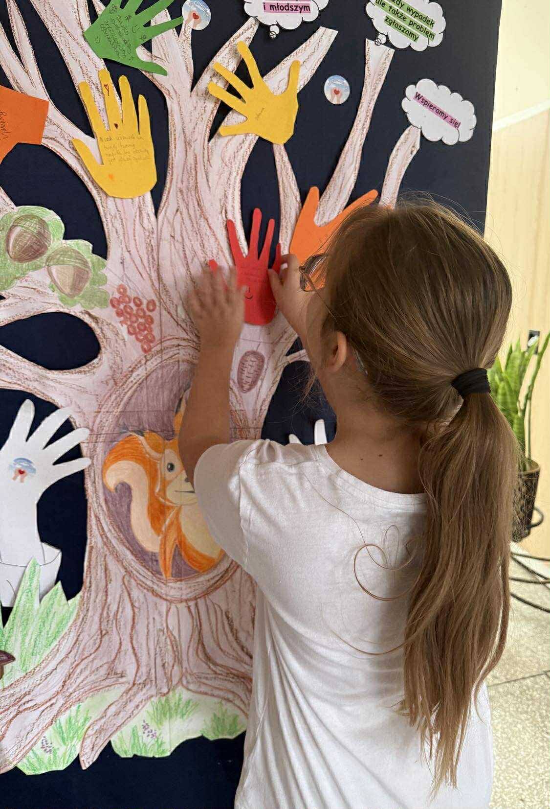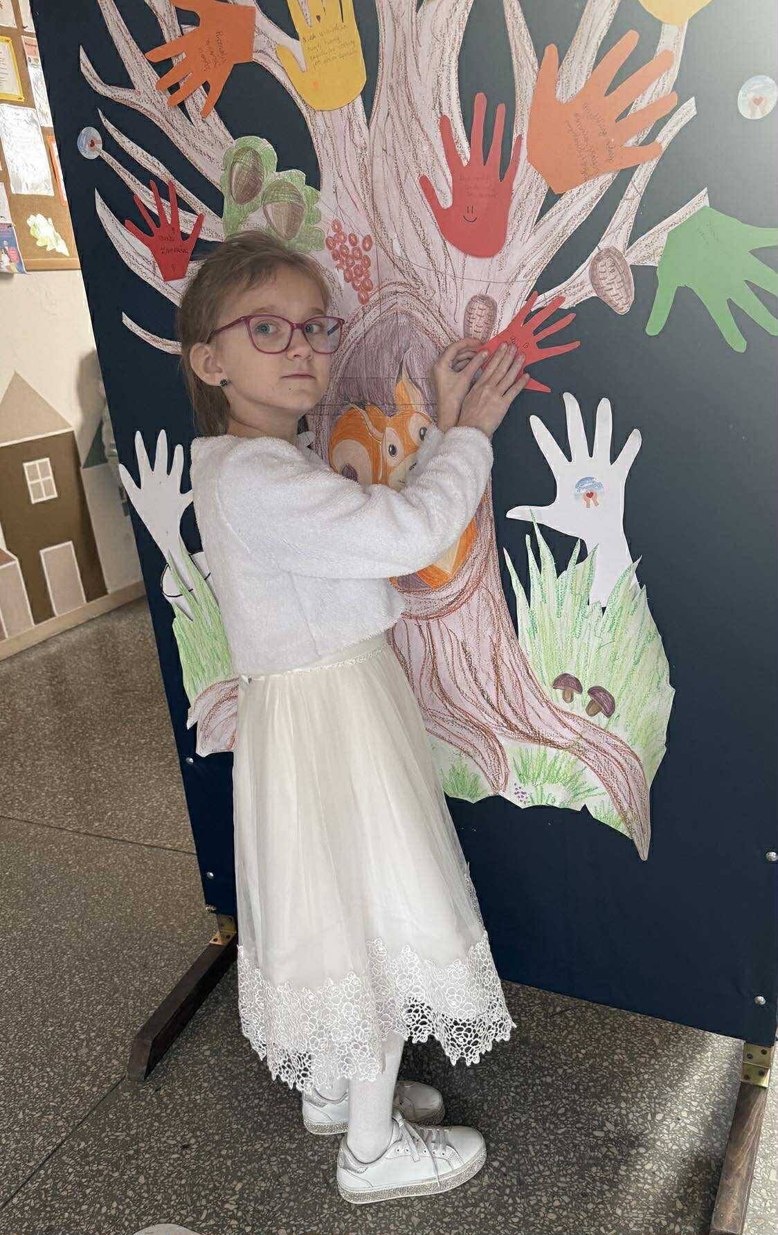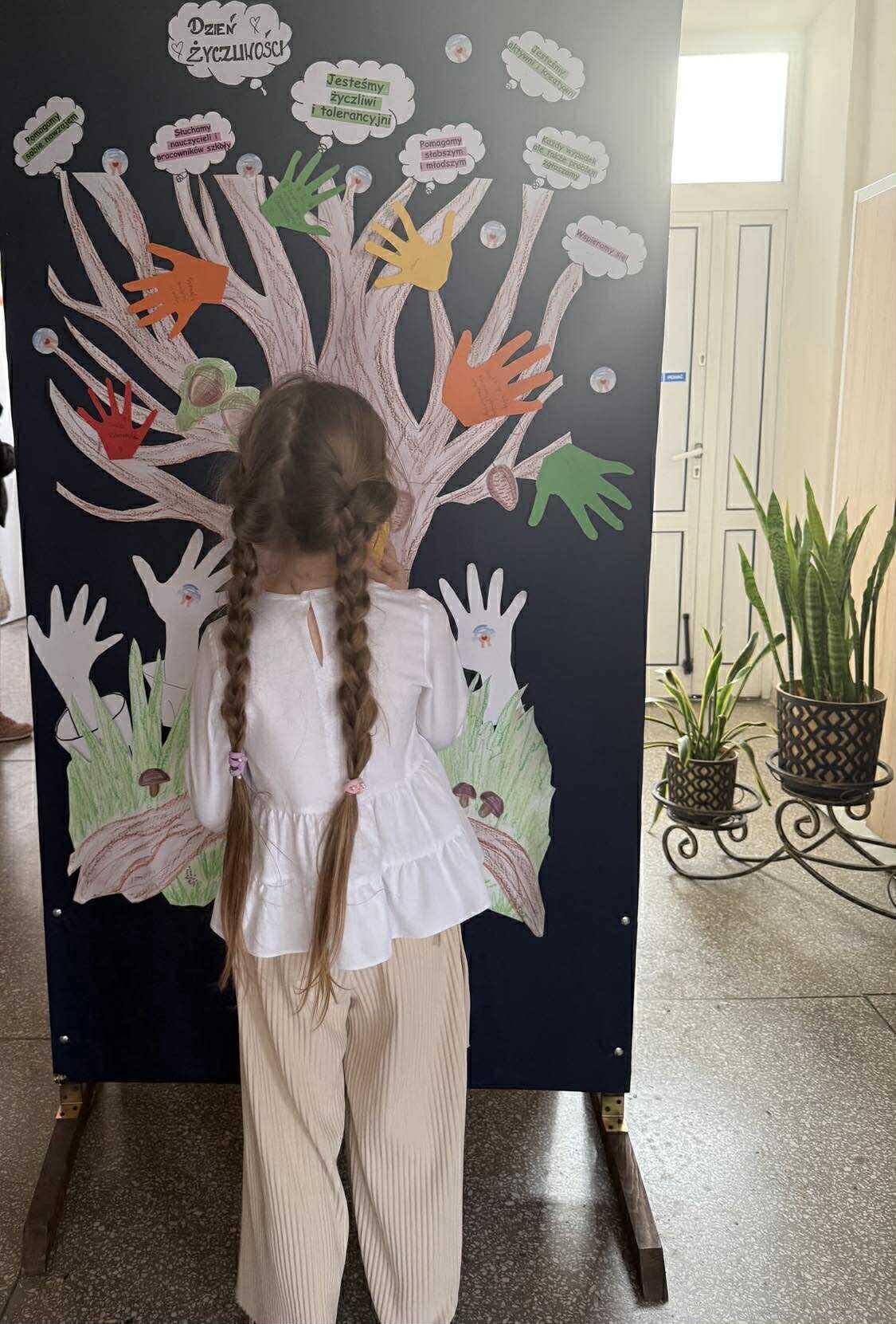 Dnia 19 listopada nasza szkoła przyłączyła się do obchodów Światowego Dnia Życzliwości i Uśmiechu. Tego dnia zorganizowane zostały różnorodne zabawy oraz aktywności, które miały na celu promowanie życzliwości i wzajemnej sympatii wśród uczniów. Jedną z głównych atrakcji były ,,Skrzyneczki życzeń”, do których można było wrzucać liściki z miłymi słowami i życzeniami. Było to miejsce, w którym każdy mógł wyrazić swoje pozytywne myśli i uczucia. Liściki zostaną odczytane w późniejszym terminie, co dodatkowo wzmocni atmosferę radości i oczekiwania. Dla młodszych dzieci zorganizowane były zabawy z piłką ,,uśmiechem”, podczas których uczestnicy rzucali sobie piłeczkę, wymieniając się miłymi słowami. W ramach Dnia Życzliwości i Uśmiechu dzieci miały również okazję wykazać się twórczością. Uczniowie wycinali swoje rączki z kolorowego papieru, na których pisali miłe słowa oraz pozytywne przesłania. Następnie rączki zostały zawieszone na „Drzewie Życzliwości”, które stanęło na szkolnym korytarzu. Drzewo stało się piękną dekoracją, a jednocześnie symbolem wspólnoty i serdeczności, która panuje w naszej szkole. Każda rączka z miłym słowem przypominała wszystkim o sile życzliwości oraz o tym, jak ważne jest dzielenie się dobrem z innymi. Dzieci były dumne z efektów swojej pracy, a drzewo z rączkami stało się miejscem, które przyciąga uwagę.