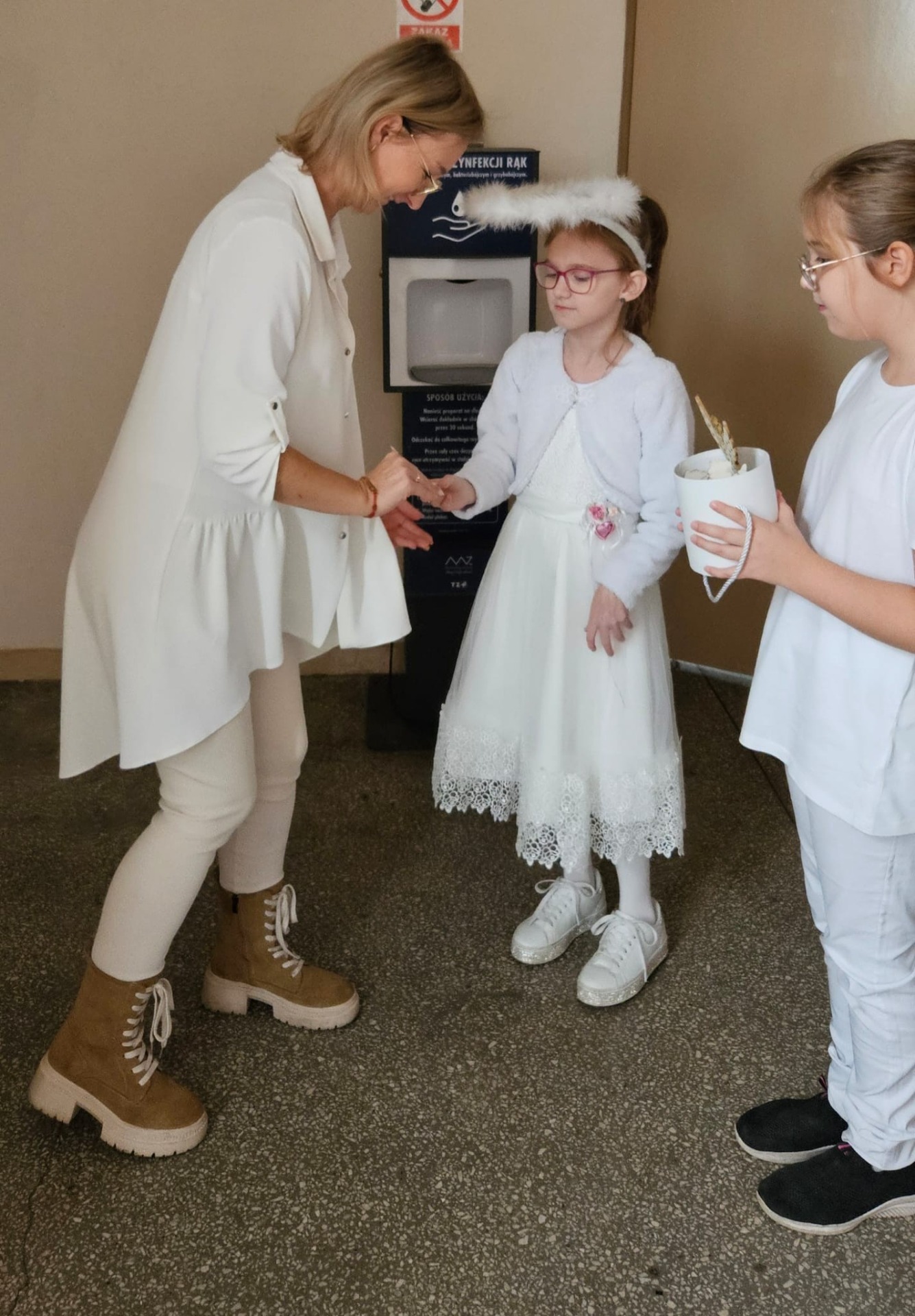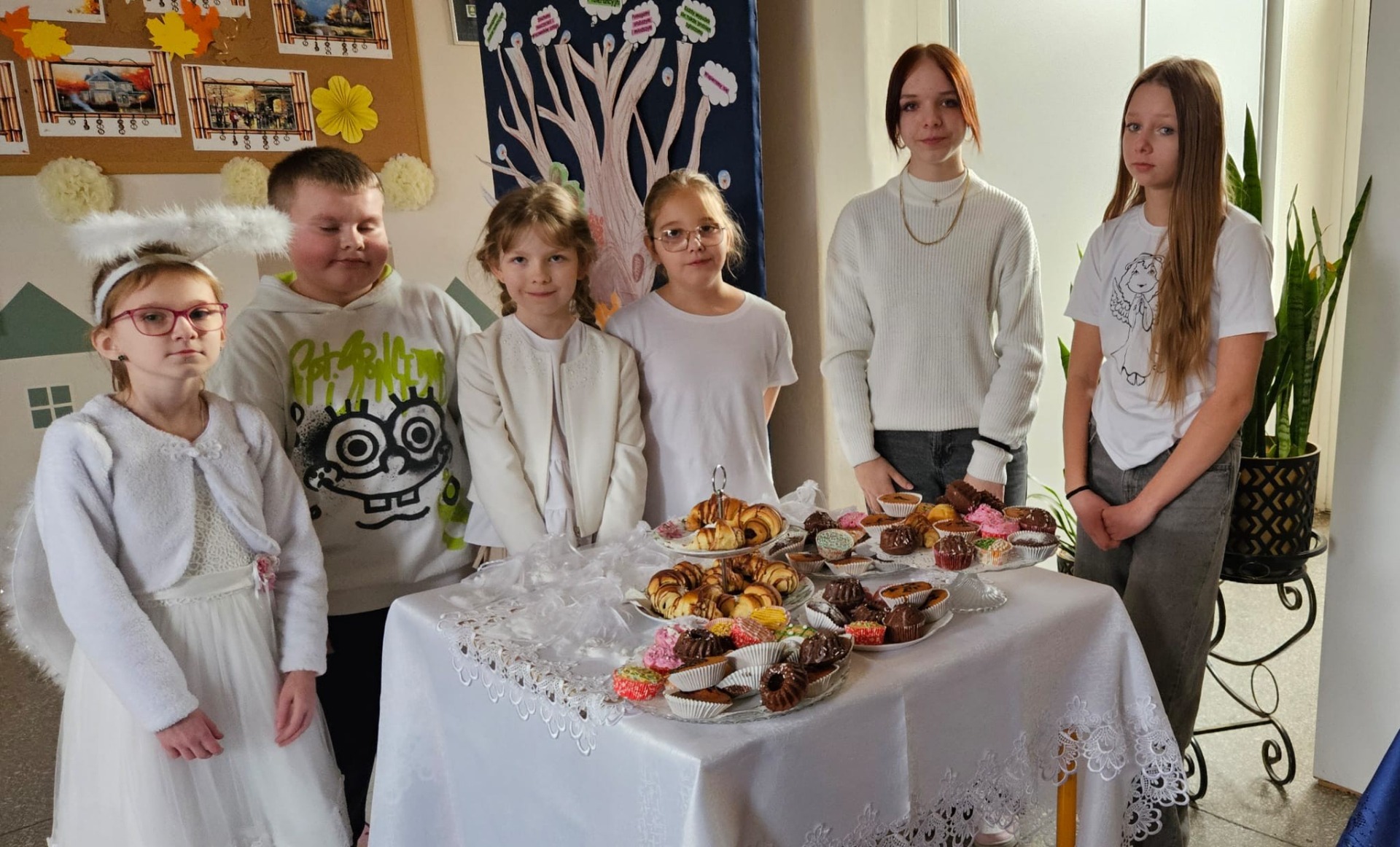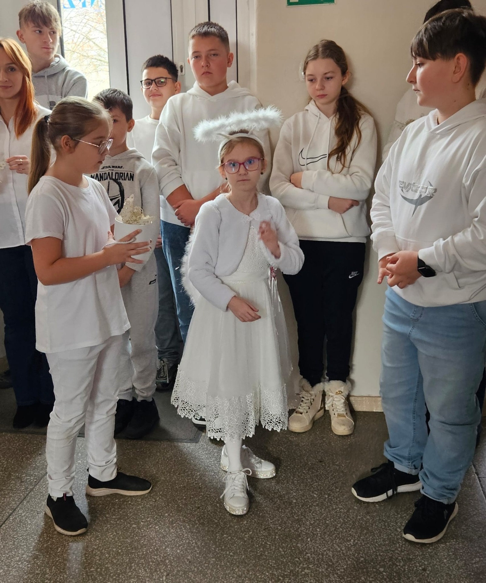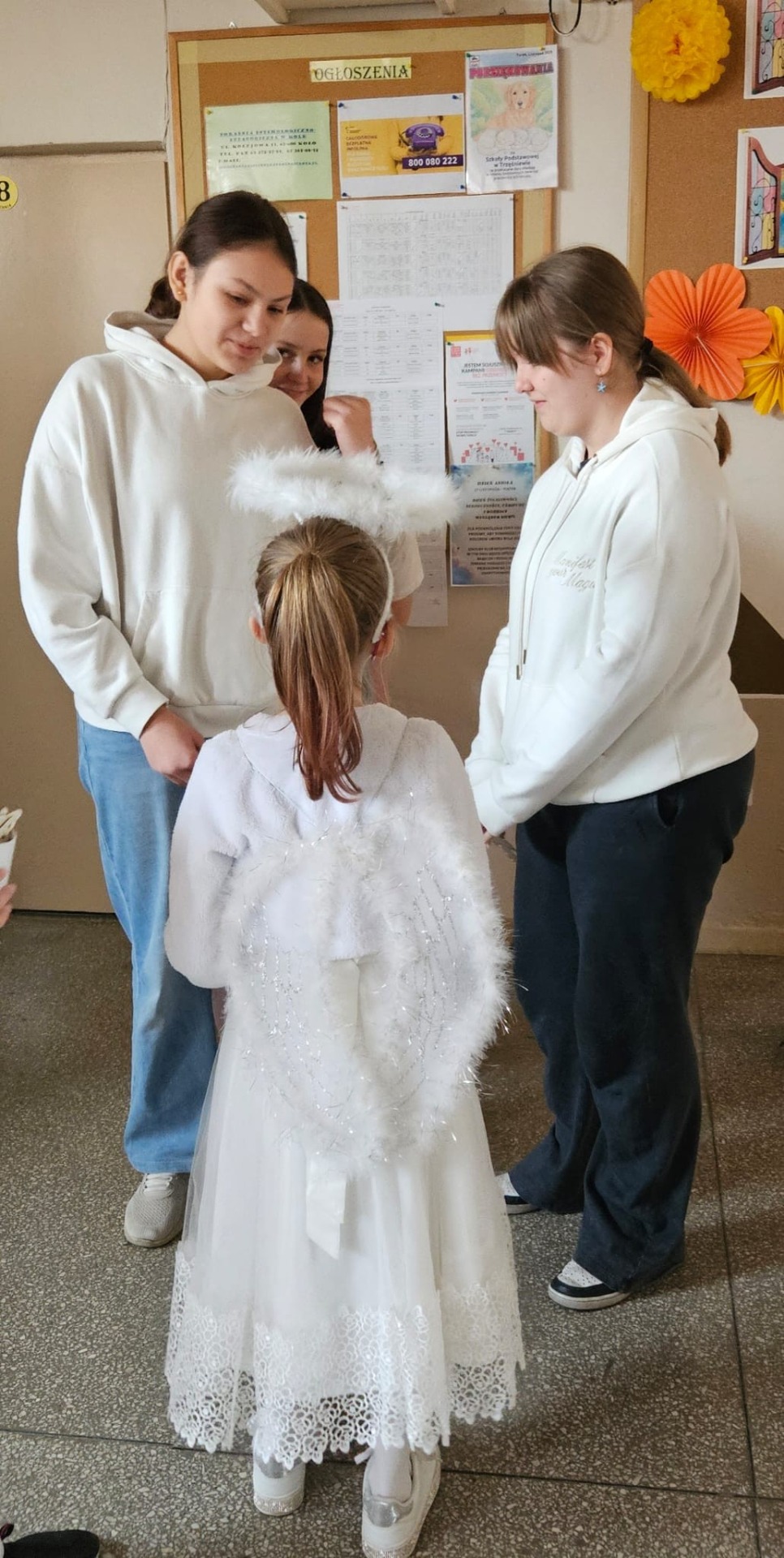 Również tego dnia Szkolny Klub Wolontariatu zorganizował Dzień Anioła. Wolontariusze, przypomnieli, jak ważna jest dobroć, pomoc, uśmiech, serdeczność wobec innych każdego dnia. Wszyscy otrzymali „Aniołka Dobroci”, który ma przypominać, że warto być dobrym nie tylko od święta, ale przez cały rok. Dużym zainteresowaniem cieszyła się fotobudka, w której uczniowie mogli zrobić pamiątkowe zdjęcia z anielskimi rekwizytami. Uczniowie otrzymali również drobne zadanie, aby powiedzieć wybranej osobie, co najbardziej w niej cenimy lub co nam się w niej podoba. Dzięki temu w szkolnych korytarzach pojawiło się jeszcze więcej ciepłych słów i szczerych uśmiechów. Szkolny Klub Wolontariatu przygotował także akcję charytatywną. Na specjalnym kiermaszu można było zakupić pyszne babeczki, ciasteczka, rogaliki oraz aniołki. Udało się zebrać kwotę 600 zł, która zostanie przeznaczona na cele dobroczynne.